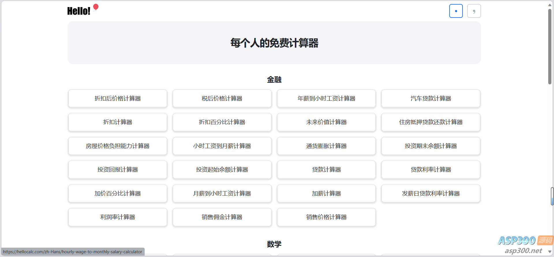 Hello Calc是一个提供免费在线实用计算器集合的网站,目前收录了超过50种金融、数学、物理、统计、日期时间、生活等实用类型的计算器。用户可以方便地使用这些计算器来计算时薪、年薪、汽车贷款、房屋价格、通货膨胀等各种需求。使用该网站无需注册登录,而且支持全球48种语言,为全球用户提供免费的计算器服务,让用户能够轻松应对各种计算需求。 声明:本站所有资源均来源于互联网收集,仅供学习参考使用,如若本站内容侵犯了原著者的合法权益,可联系我们进行处理。