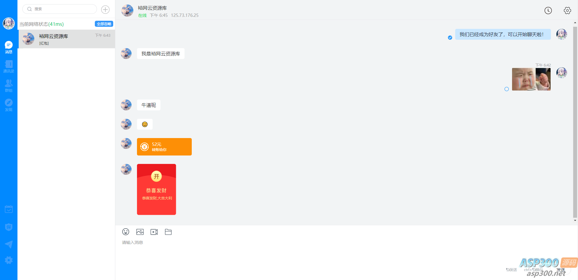 群聊:轻松实现群组聊天,支持单人禁言、全员禁言、群红包、@TA、设置管理员、踢群成员、禁止退群等灵活的成员和权限管理,同时支持大群的消息历史记录漫游和进一步提升。