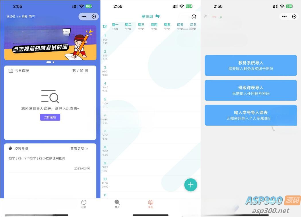 对接微信公众号每日课表推送 三种导入课表方式可供选择 班级课表导入 爬虫导入课表 学号导入课表 声明:本站所有资源均来源于互联网收集,仅供学习参考使用,如若本站内容侵犯了原著者的合法权益,可联系我们进行处理。
