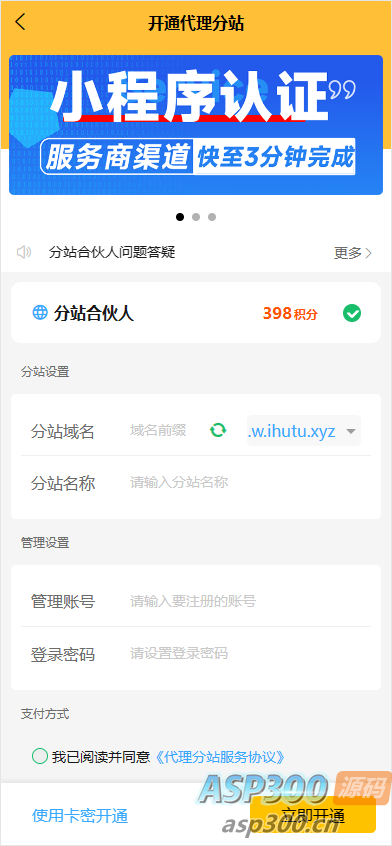 补充:小程序配置 需要认证小程序上传H5代码即可 如没有认证的 可以使用网页版H5以及PC端 微信支付 支付宝支付 注册短信 微信登录全部正常 带提现功能 代理分站