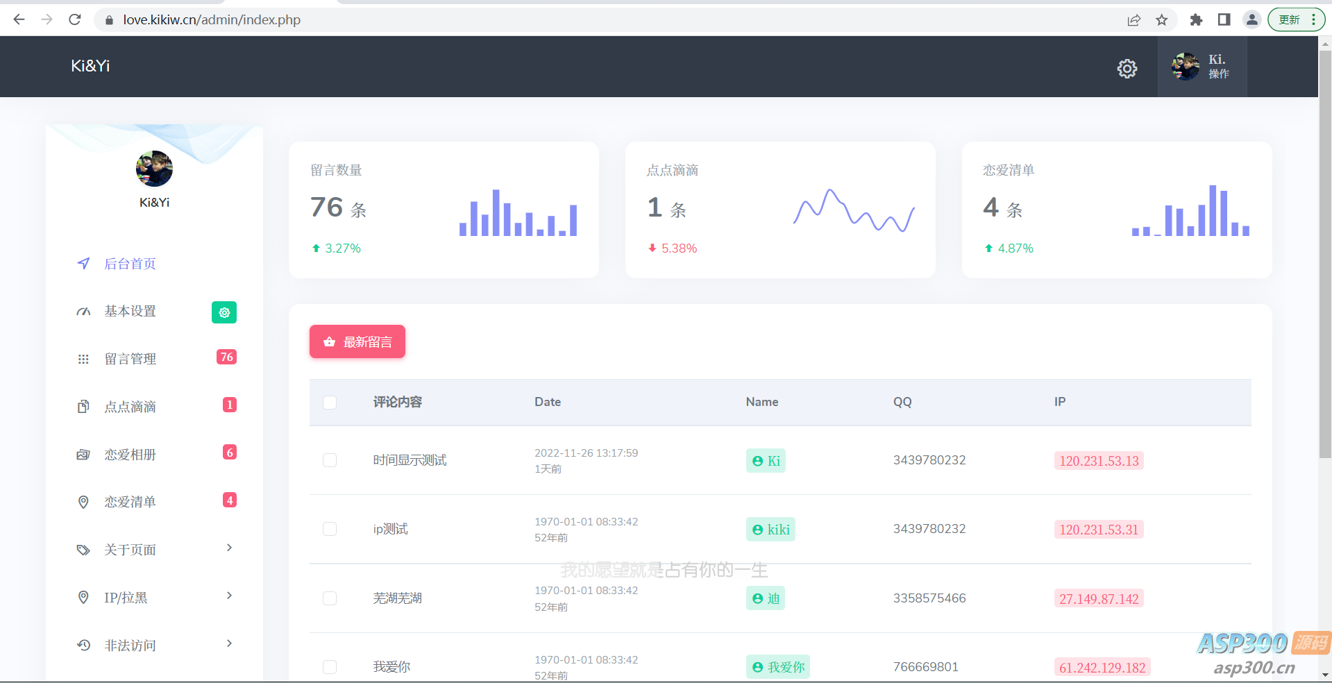 前后端都是使用了 grid 栅格 flex 弹性布局 高斯模糊效果 前端简约配色没有过多的复杂效果前端首页分四个子页面 点点滴滴 留言板 关于我们 恋爱列表LikeGirl 5.1.0调整前端点点滴滴页面内容标签样式调整前端留言祝福页面留言卡片、留言信息输入框样式调整前端恋爱事件PC端卡片显示宽度调整后台首页数据统计图标修复前端多处存在文本内容溢出问题新增恋爱事件标题支持