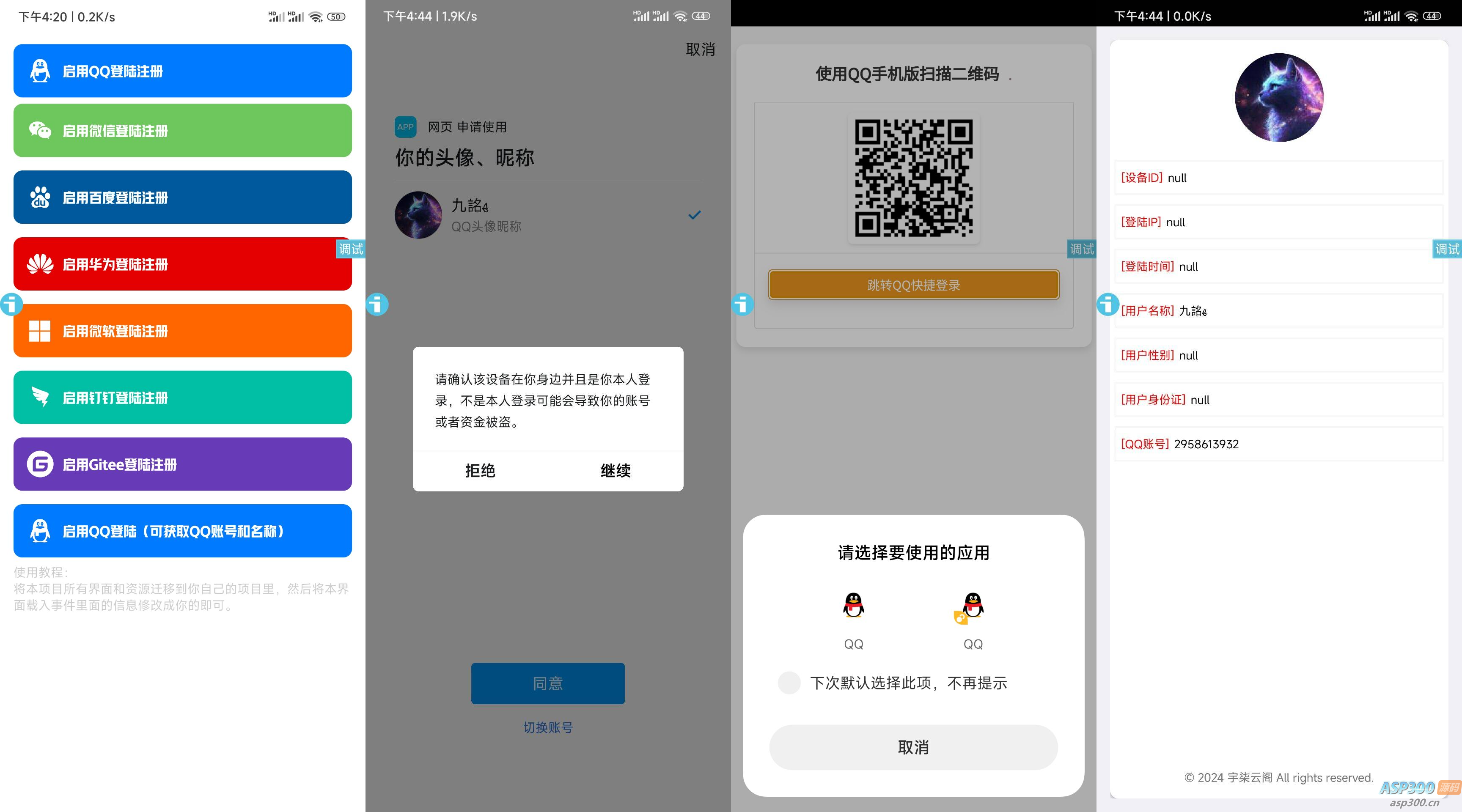 首先声明本接口源码永久免费(懒得写收费),前面旧版的接口都是调用QQ互联接口的所以都没办法获取到QQ账号,所以我耗费了点心思搞了这个接口,它是调用官方QQ登录的而且是服务器本地调用不介入第三方,虽然现在的源码是iAppv3的(主要是这玩意简单,做演示很不错),但是接口不仅可以在iApp使用,也可以在其他的编辑器应用(包括网站和软件),接口调用也很简单,就是直接访问接口电脑端就是扫码登录,手机端则可以拉起QQ而且确认登录之后可以直接返回软件!另外它不仅可以回调QQ账号和名称还可以回调pskey和superkey懂的都知道这玩意有什么用,这儿就不多解释了。