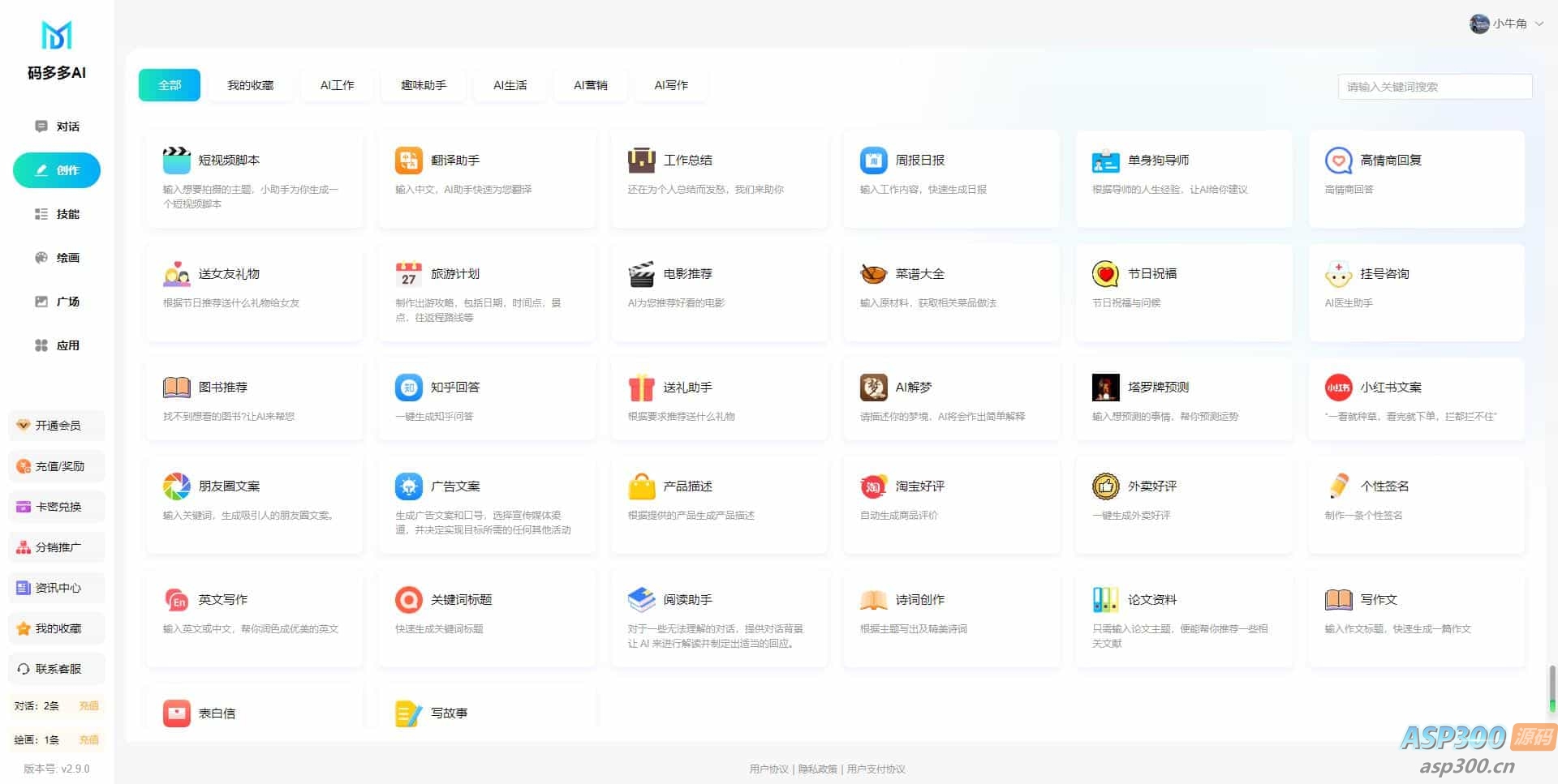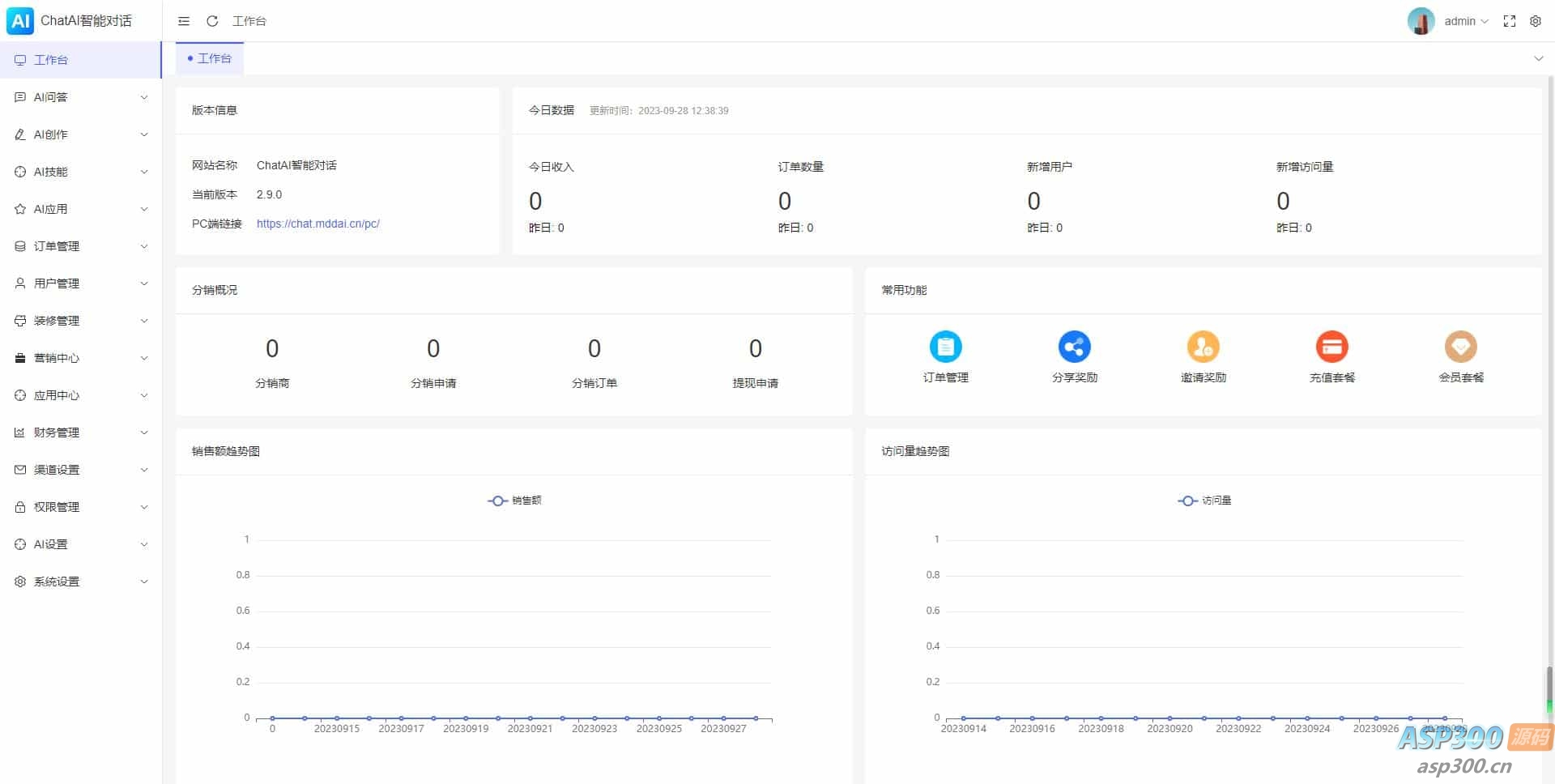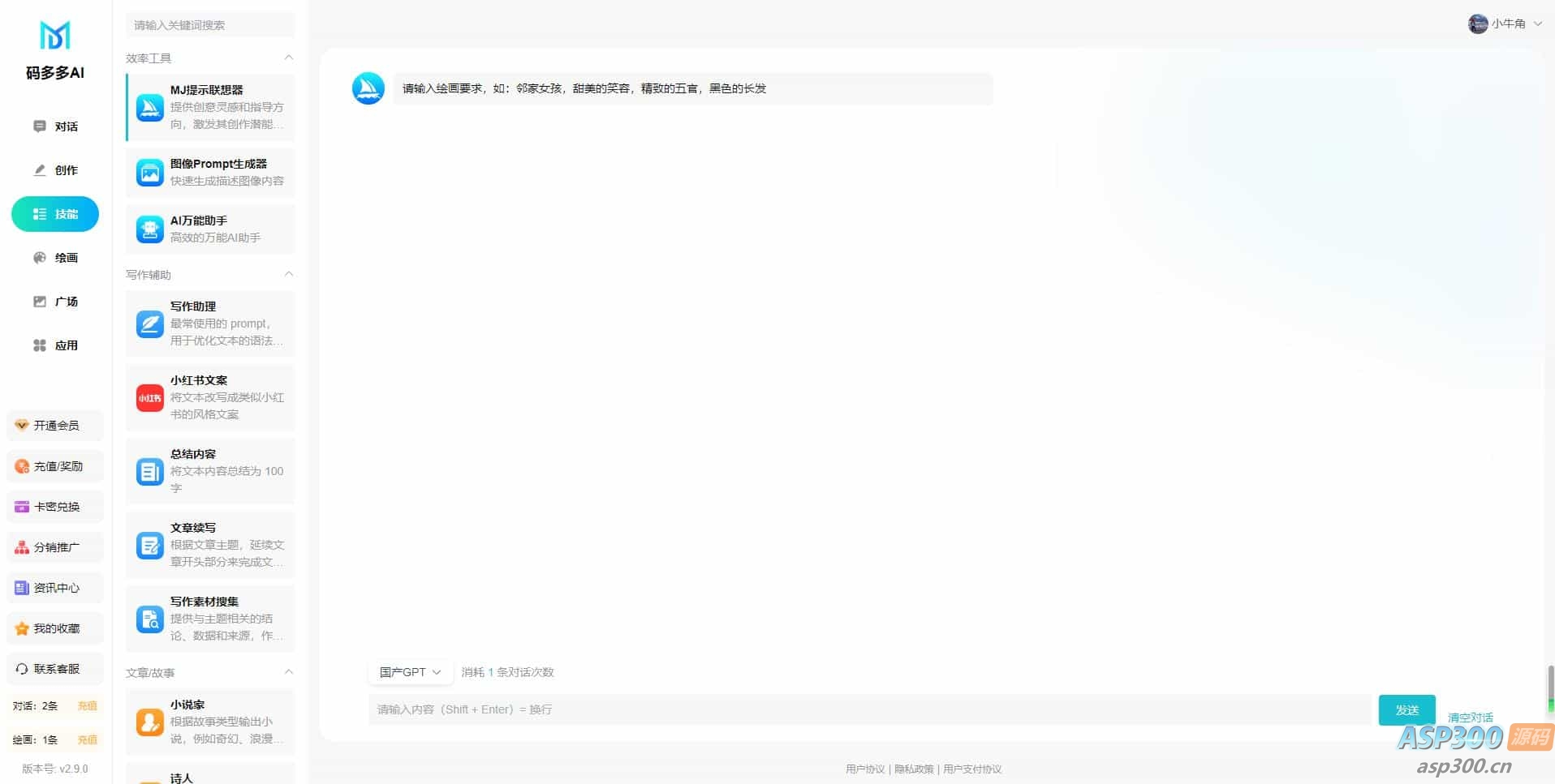 实现了AI对话+AI绘画的融合使用。系统功能包括:AI智能对话、AI创作模型、AI绘画、分销推广、会员套餐、