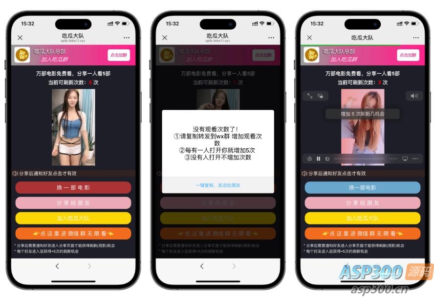 第一次访问送五次观看次数,用户达到观看次数后需要分享给好友或者群,好友必须点击推广链接后才会增加观看次数。