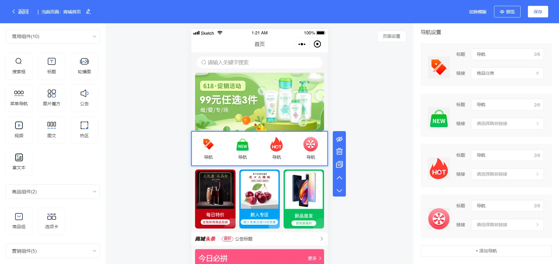 全商城界面可视化拖拉拽DIY,多模板,多风格机制,极大便利运营装修。