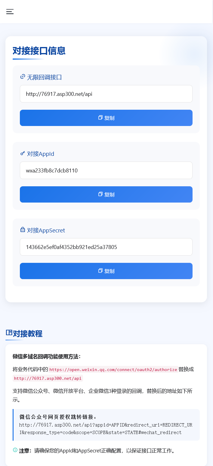 这是一款开源程序二开的微信公众号多域名回调系统,全新UI,简洁美观