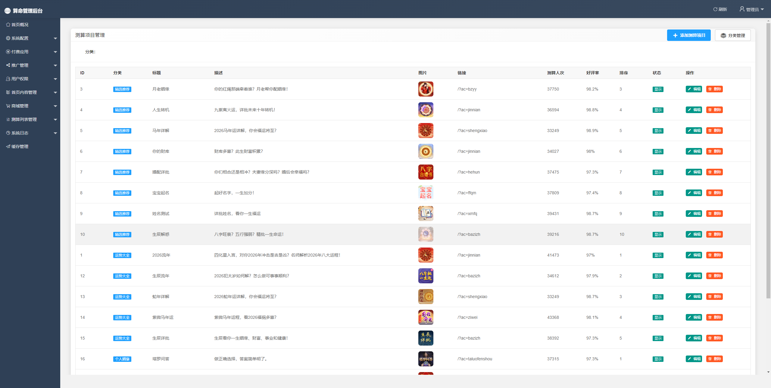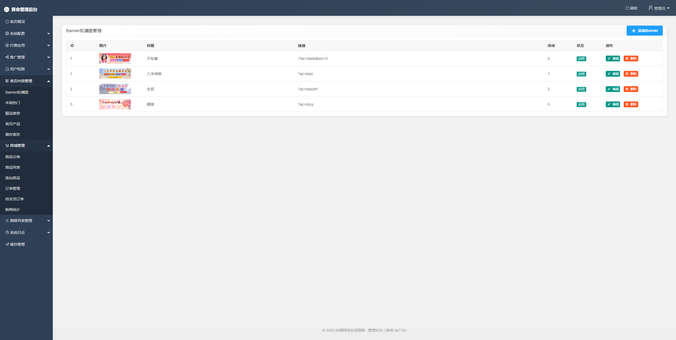 2026年更新 后台框架改用layui 更加稳定 美观 前端首页后台可控制项目 图片 新增商城功能 更新马年运势模板/八字神煞/八字终身运/ 新增塔罗问答模板 新增个人运势免费查看 新增择吉日(结婚吉日/订婚吉日/领证吉日/搬家吉日/开业吉日/入宅(迁新居)吉日/装修吉日/出行吉日/开工吉日/买车/提车吉日/动土吉日/提亲吉日/买房吉日/理发吉日/签约吉日) 声明:本站所有资源均来源于互联网收集,仅供学习参考使用,如若本站内容侵犯了原著者的合法权益,可联系我们进行处理。