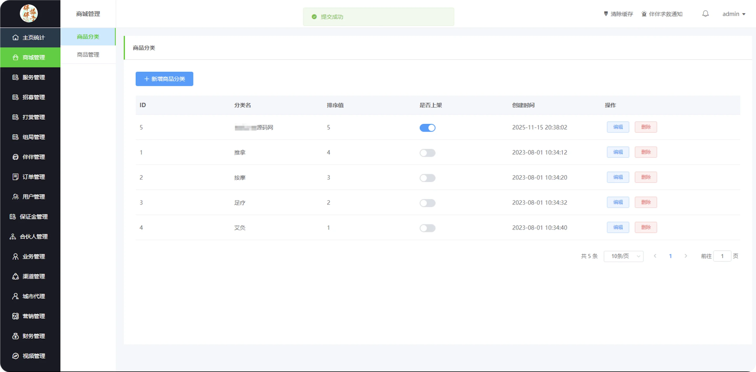 商品/服务分类管理:支持分类的增删改查、排序与上下架。