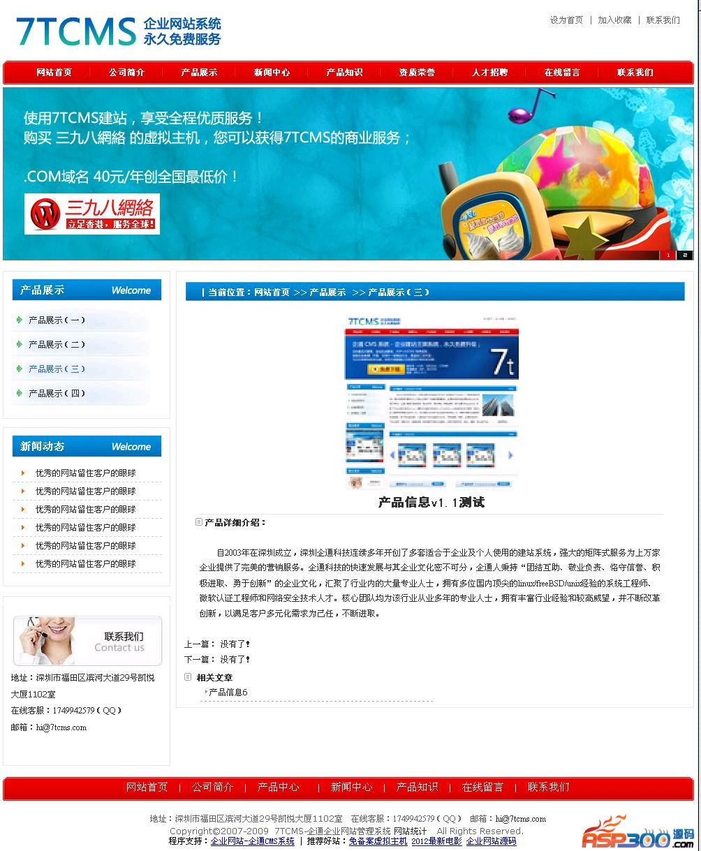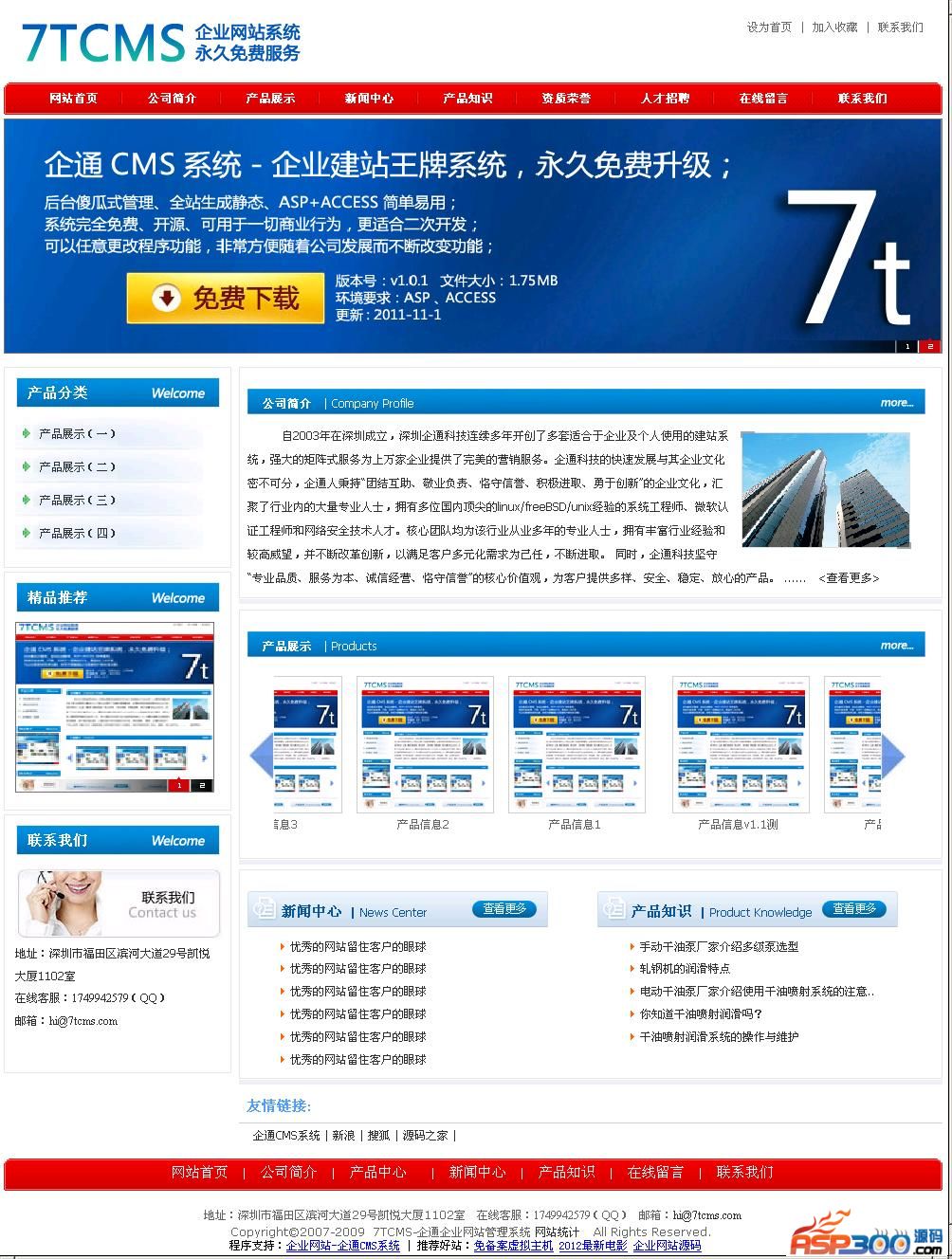 7tcms是企通科技研发的企业网站管理系统,是一套通用并开源的程序,美观的前台和强大的网站后台管理功能运行安全、稳定、快速、全自动化。强大的栏目自定义功能和静态化是站点最优秀的特点。,对于SEO有很好的效果,系统是基于ASP+ACCESS技术开发,真正实现了上传即可使用的简单流程;7TCMS企通企业网站管理系统 v3.5更新说明:产品展示新增了产品参数格式;7TCMS企通企业网站管理系统 v3.1升级说明应广大朋友的要求,修改了内页代码,以加强内页对SEO的效果,完善了后台操作流程和静态化生成的流程;7tcms基本功能:
