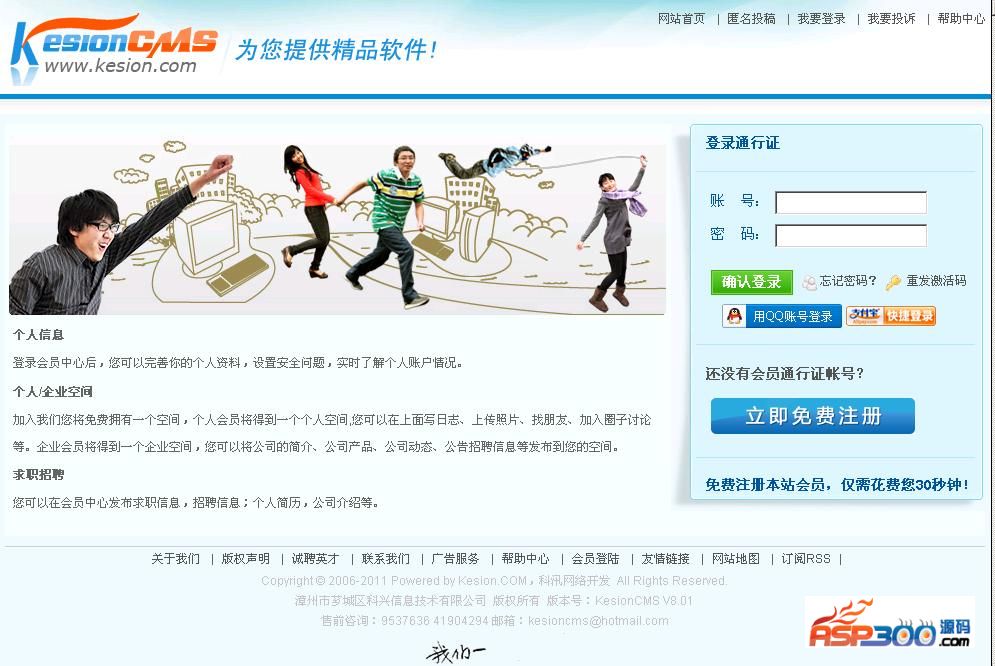 KesionCMS是漳州科兴信息技术有限公司开发的一套万能建站产品,是CMS行业最流行的网站建设解决方案之一,V9.0采用ASP+ACCESS/MSSQL架构,系统具有极强的可扩展性,并且一直以来完全开放源代码;这套系统自2006年发布的第一个版来以来,以其简单易用、功能强大、拓展性极灵活而倍受广大用户的青睐,至今已累计数十万的用户群。拥有CMS业界最全的功能,是适合任何网站的最佳解决方案功能模型十分齐全,系统拥有CMS业界最全的功能,含文章、图片、下载、商城、供求、人才、动漫、微博、影视、考试、团购、房产、问答、论坛、会员、博客空间、黄页、产品库、专题等十几个主系统和采集、调查、评论、搜索、公告、PK、心情指数、顶客DIGG、签收等几十项子系统组合而成,代码完全开源化,在尊重版权的前提下能极大的满足站长对于网站程序进行二次开发,以满足任意网站的任何需求;系统采用模型拓展,用户可以根据网站的需要,自行在后台通过自定义模型和字段来实现各种网站的功能需求,通过自定义表单实现在线报修,报名,在线反馈等系统;系统在安全性、稳定性、易用性方面具有较高的声誉,深受广大站长推崇,其灵活的产品架构、极强的可扩展性和可伸缩性完全能最大化满足站长目前及今后的应用需求人性化的管理操作平台,灵活的模板标签管理人性化的管理操作平台和灵活的模板标签管理,倍受广大用户的喜爱,系统将前台的模板和标签分离,全面支持table和div+css,让模板制作更加灵活,不局限于某种风格,随心所欲的DIY,让您的网站页面可以随时更换风格随时更改布局,万能标签让您实现各式各样的网站效果,不懂代码没关系,我们还有多种标签样式可以选择,只需轻松的点点您的鼠标,一个网站就做好了。栏目无限级分类并支持绑定顶级或二级域名系统支持栏目无限级分类,并可对系统栏目进行一级或N级栏目的排序操作,对栏目之间的内容进行复制(CTRL+C),粘贴(CTRL+V)操作,对栏目的内容进行合并,对栏目或文章进行批量的绑定模板或设置文章的属性,点击次数等; 另外新版中栏目支持绑定顶级或二级域名,满足为了方便用户记忆或便于SEO或者大型网站的需要。强大的搜索引擎(SEO),自定义生成路径系统支持动态asp,伪静态(带组件和不带组件),全静态三种生成方式,并且可以自定义生成的Html路径,方便自己做SEO,用户可以根据网站的需求随意选择。无处不在的SNS互动元素,让您的爱站更具交流互动性在这个日新月异的网络时代,KesionCMS始终以用户体验为导向,在本次V8.0版本中,融入更多的SNS。博客日志管理功能、相册管理功能、朋友圈管理功能、群组讨论管理功能、新鲜事、网友动态、最近谁来看过我、空间留言、日志评论、RSS在线订阅管理功能、收藏夹管理功能、邮件群发功能、短消息服务等实用功能;无处不在的SNS互动元素,让您的爱站帮助所有用户在浏览您的网站时更好的交流互动。灵活的商业运营模式,完善的用户权限分配系统和资金明细KesionCMS系统拥有一套健全完善的会员体系和完整的支付平台接口。可以在后台自由设置会员组,可以对栏目和文章设置会员浏览时权限及查阅所需消耗的科汛币金额;会员在会员中心可以在线充值或购买点卡进行充值;另外,网站的管理员在后台可以详细的查看资金明细,用户在前台会员中心也有详细的资金明细表。这样一来,网站可以通过销售点券,积分,充值卡,资金等来进行盈利。打破传统CMS系统瓶颈,系统自带功能强大的论坛BBSKesionCMS打破CMS系统瓶颈,系统自带功能强大的BBS,不再为了整合第三方论坛平台而烦恼,一站式用户登录,系统还集成腾讯QQ,新浪微博及支付宝快捷登录,只需绑定下帐户,以后可以直接用QQ号或支付宝帐户登录。论坛拥有大型论坛的功能,可自定义版面分类、版规说明、版主分配、权限分配、设置积分和威望、论坛等级头衔设置,还可以将版面设置为认证版面,只有特定权限的用户才能进入认证版面发帖。发表主题后,可以只看该作者及查看该作者发表的主题;可以在会员中心查看自己发表的主题;可以对用户帖子进行点评,回复,还可对精典的帖子内容进行置顶,加精等操作。