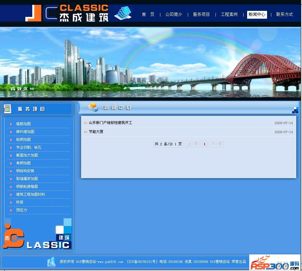918 天蓝型企业展示系统旨为打造一个最简单漂亮大方的网站,主打展示型。该程序前台页面结构比较简单,但页面美观十分值得赞赏。前台栏目有:首 页、公司简介、服务项目、工程案例、新闻中心、联系我们。网站以天蓝色系为主,flash也很具特色,底部加入了漂亮大气的百度搜索框模块。前台页面结构简洁明了又别树一帜。