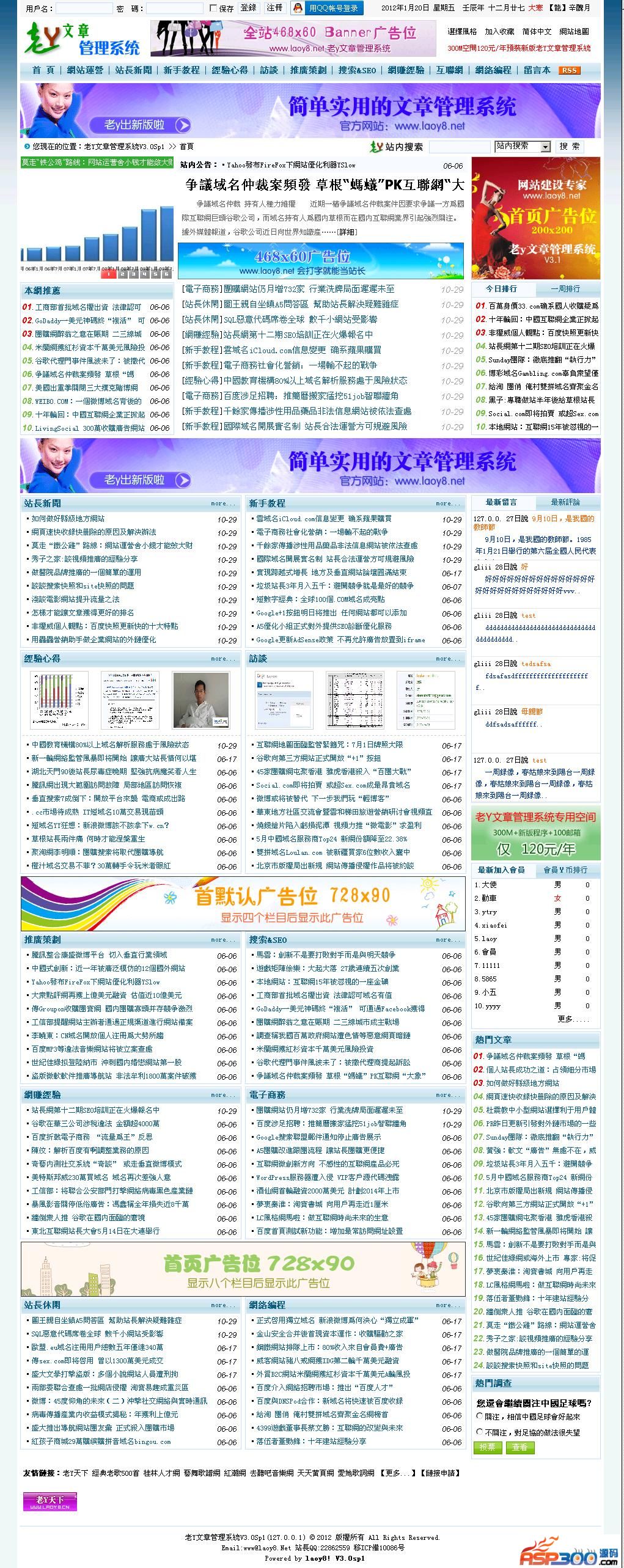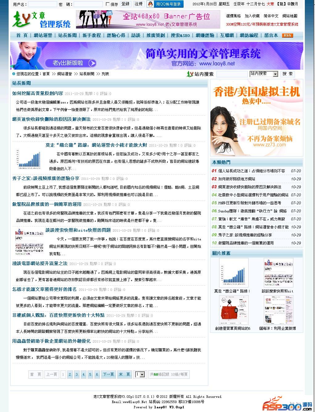 本网程序是根据老Y修改而来,感谢老Y文章系统的支持!本程序是在老Y3.0sp1的基础上加上一些板块然后通过完整的数据组合而成,页面布局清晰美观,板块齐全,适合个人类新闻站点的开设。 老y文章管理系统,采用Asp+Access开发,适应中小新闻文章型网站及个人网站需求,整个网站采用Div+Css布局,IE6、IE7、IE8、Firefox、Chrome下测试无误.程序说明:如果放在根目录,不需要修改任何东西即可运行放在根目录,不用任何修改即可正常运行;如果放在虚拟目录,请打开inc/config.asp修改SitePath="/目录名/"请确保你的空间支持FSO及AspJpeg组件,否则可能有些功能无法使用默认后台管理路径admin/admin_login.asp,用户名admin密码admin1357安全设置[重要]:inc/config.asp中修改数据库名称和后台目录,并在Data目录下将数据库以及Admin目录重命名登陆后台后请马上修改管理员用户名及密码v1.5sp1版更新和修正了:1、美化了整个页面布局。2、简化了源码大小,去处所有图片文件。3、增加了论坛栏目。4、修正了QQ登陆数据。5、修正了首页缩略图,上传文章可以自动生成。6、如果网站出现白页可以在风格管理中选择更新所有CSS。7、网站论坛在栏目修改论坛指向链接即可。本网程序是根据老Y修改而来,感谢老Y文章系统的支持!本次更新去除了所有图片文件,减小了源码大小,能更有利于网站的优化与改版,并且加入了论坛栏目有利于站内交流活跃人气。如有技术疑问可以联系QQ1754326269