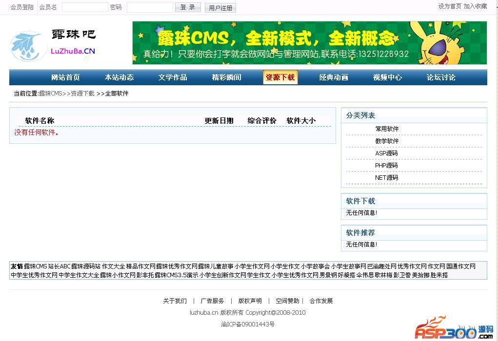 露珠CMS是一个以文章类、下载类、图片类、动画类、视频类为主的综合网站。我们的目标:麻雀虽小,五脏俱全!致力于打造互联网上程序最小功能齐全的网站源码,只要你会打字就会做网站和管理网站。