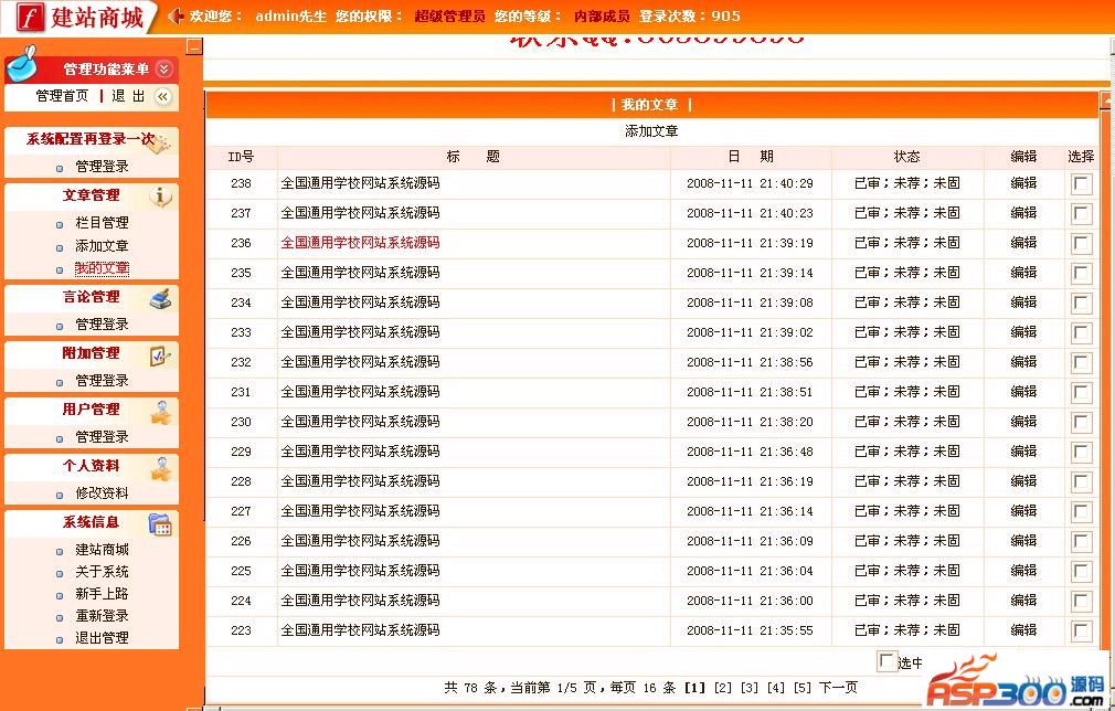 专题管理、评论管理、留言管理、文章审核、文章检索、投票管理、公告管理、友情链接、广告管理、备份压缩、阿江探针、附件管理。