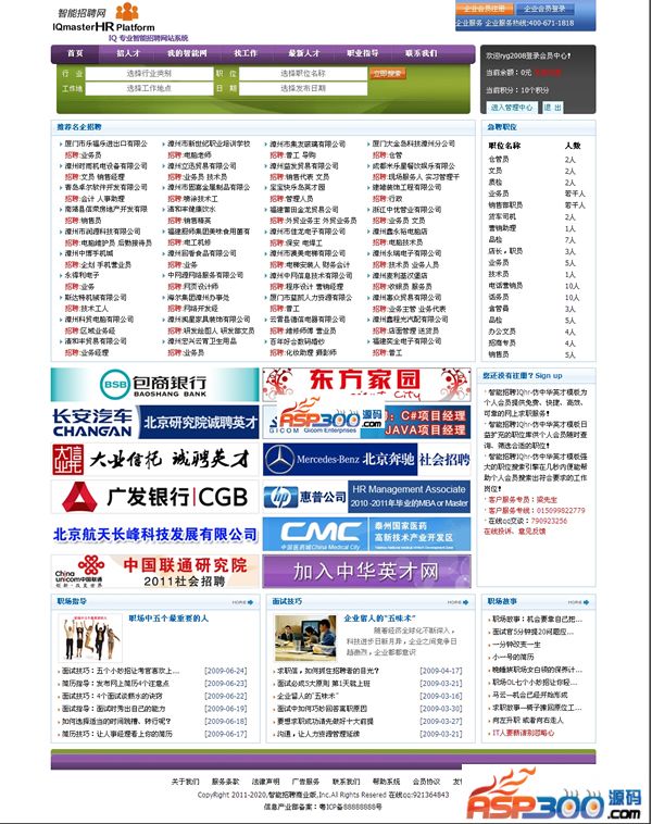 智能招聘人才管理系统,功能强大,系统基于ASP+ACCESS技术开发的网站管理系统,仿真中华英才模板基于Win32平台,采用win2003运行环境。其安装简单方便,只需将程序上传至服务器后即可使用;强大的企业招聘、个人求职、高级人才、兼职人才、职业指导、通用页面、及强大的在线支付与自定义标签等功能,并实现了支持邮件群发的功能,使网站与会员之间的联系更加方便;同时人性化系统设计和管理方便的后台系统,不仅可以让不具备网络知识的人员轻松地操作管理,而且可以节约后台管理所需的人力资源;适合所有地区和行业用于建设网络招聘类网站使用。