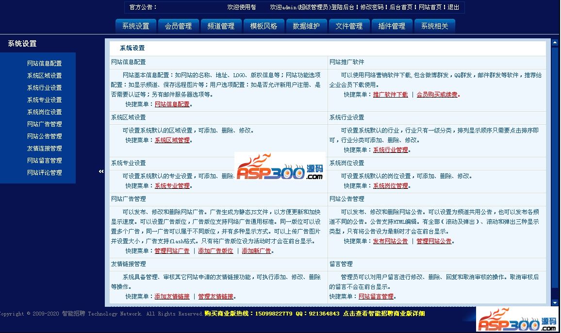 网站信息配置、系统区域设置、系统行业设置、系统专业设置、网站广告管理、网站公告管理、友情连接管理、网站留言管理、网站评论管理、用户资料管理、审核新用户、用户组管理、用户等级管理、管理员添加、管理员管理、系统频道设置、个人求职管理、企业招聘管理、高级人才管理、兼职人才管理、职业指导管理、通用页面管理、模板方案管理、网站模板管理、风格样式管理、通用标签管理、备份数据库、恢复数据库、压缩数据库、执行SQL语句、系统空间占用、HTML文件生成、HTML文件管理、会员上传管理、上传文件管理、在线支付设置、调查投票管理、访问统计管理、邮件群发管理、清除系统缓存、前台日志管理、后台日志管理、系统帮助设置