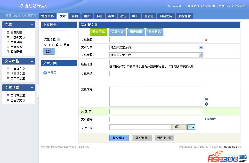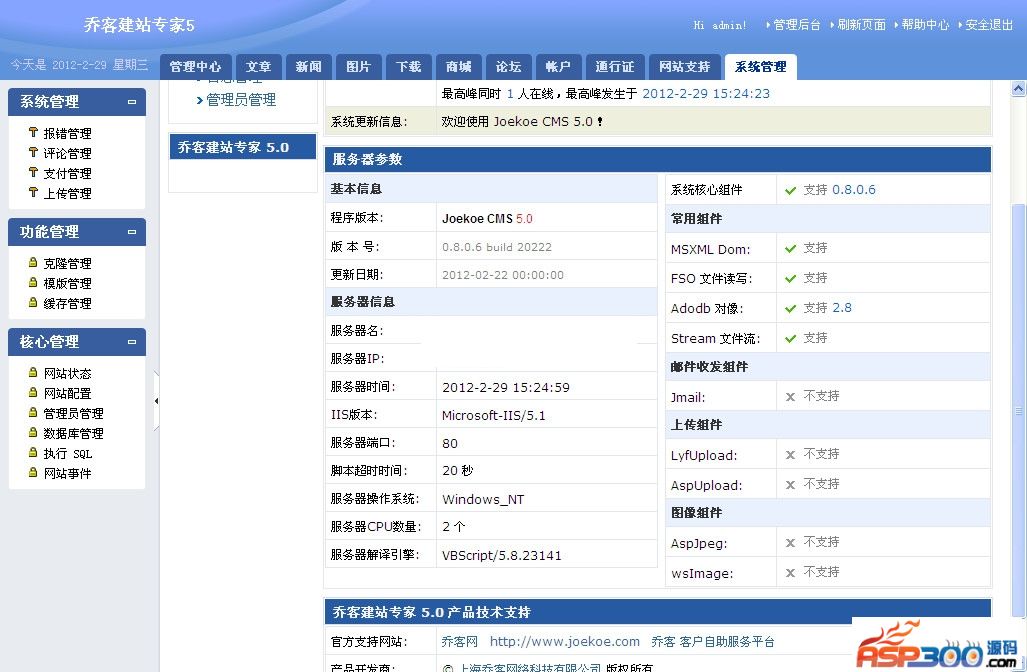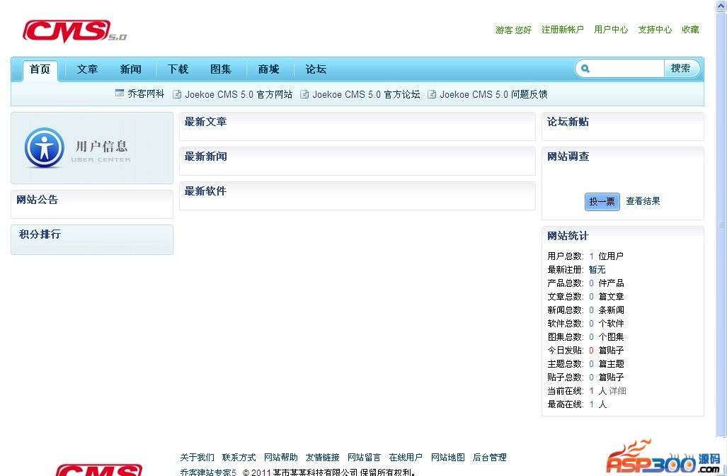 Joekoe CMS 5.0 不只是一个论坛,它也不只是一个商城或文章系统,而是一个由商城模块、论坛模块、文章模块、下载模块、图片模块、问答模块、音乐模块*、电影模块*、二手模块*、供求模块*、在线客服模块*、实时交互模块*、个人门户模块、站点模块、留言模块等15个频道功能模块及会员系统、收费系统、评论系统、广告系统、采集系统等5大系统功能模块块组成的综合信息管理与会员互动的网站管理系统。乔客建站专家 5.0 特性介绍乔客建站专家 5.0 为乔客网科精心设计的一款动态建站产品,全名为“乔客互动网站管理系统”,其独特的网站系统设计理念,集多种动态网站常用模块,随需而变的帮助您解决网站系统的烦恼。乔客建站专家 5.0 包含的模块组成有:文章、新闻、下载、图片、商城、论坛等主模块,用户中心、通行证等核心模块,公告、投票、留言、友情链接等公共模块,频道内容支持评论、推茬、用户发布等辅助功能体系。目前的版本号为 Joekoe CMS 5.0 (CMS5) RC build 20222