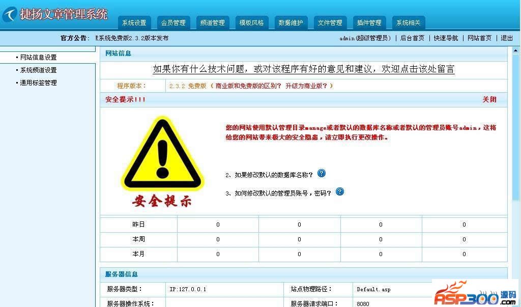 JYCMS(捷扬文章管理系统)是在Asp+Access/Mssql环境下开发的开源产品。JYCMS以信息为主题,通过以文字和图片标题为起点,以无限栏目分类为支撑,以达到信息门户的远景!JYCMS设计了全新的模板引擎,用户可以通过标签的自由组合,实现更丰富多彩的页面效果。JYCMS以安全第一为原则,解决了ASP程序的常见漏洞问题。程序自身无任何后门,严格的代码过滤为网站的安全运行提供了可靠的保障。捷扬文章系统后台功能模块:系统设置:网站信息设置 网站公告管理 网站广告管理 友情链接管理 网站留言管理 网站评论管理 文章心情管理 关键词管理 文章作者管理 文章来源管理会员管理:系统会员管理 会员等级管理 管理员管理频道管理:系统频道设置 文章频道管理 会员文章管理 回收站管理 文章Tags管理 敏感词管理 通用页面管理模板风格:模板方案管理 网站模板管理 风格样式管理 通用标签管理数据维护:备份数据库 恢复数据库 压缩数据库 执行sql语句 系统空间占用文件管理:Html文件生成 Html文件管理 上传文件生成插件管理:文章采集管理 生成SiteMaps 外部调用设置 HTML转JS代码 Js转HTML代码 调查投票管理 在线监测木马 充值卡充值管理系统相关:清除系统缓存 后台日志管理 前台日志管理免费版2.8.30到3.3.1版本升级内容: