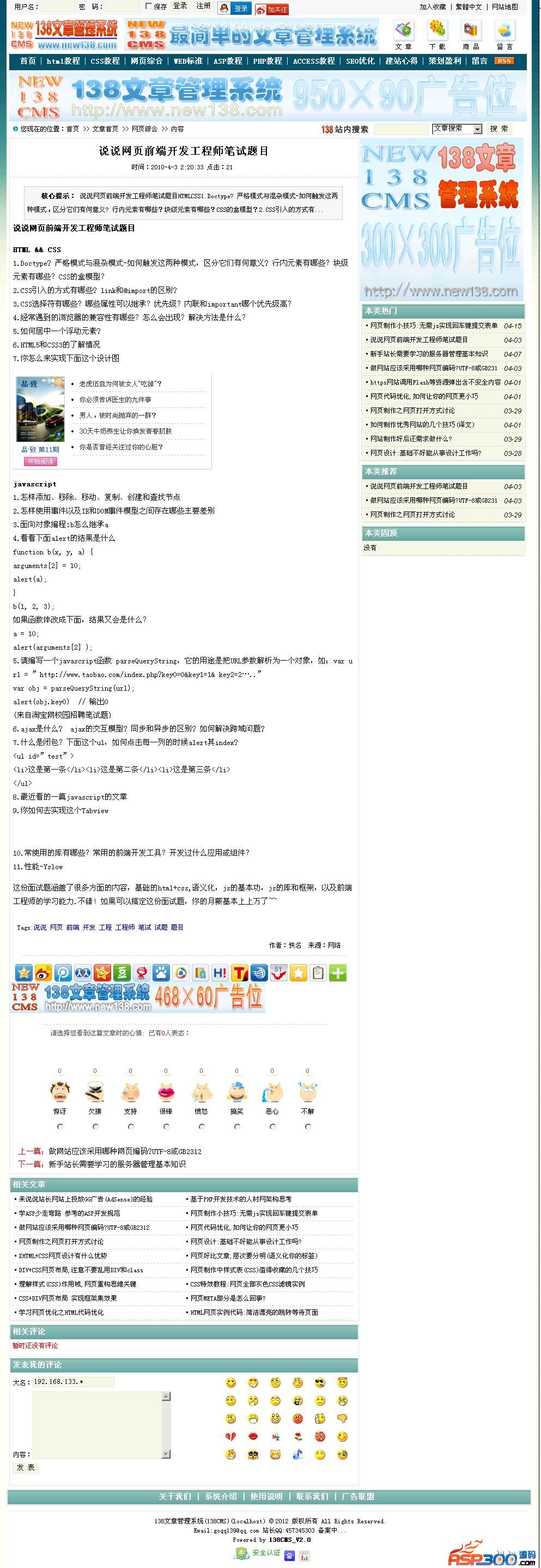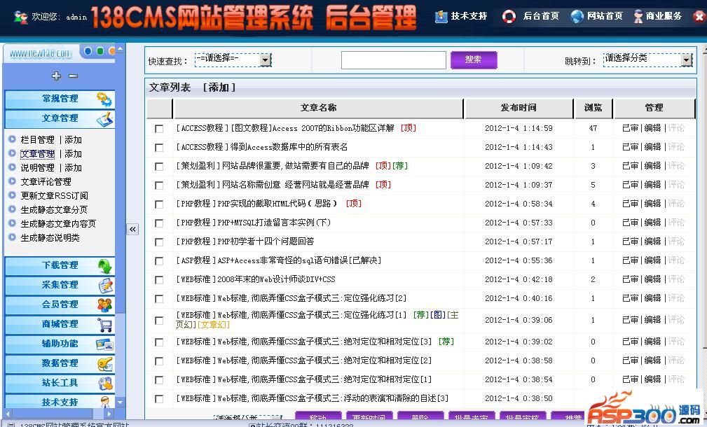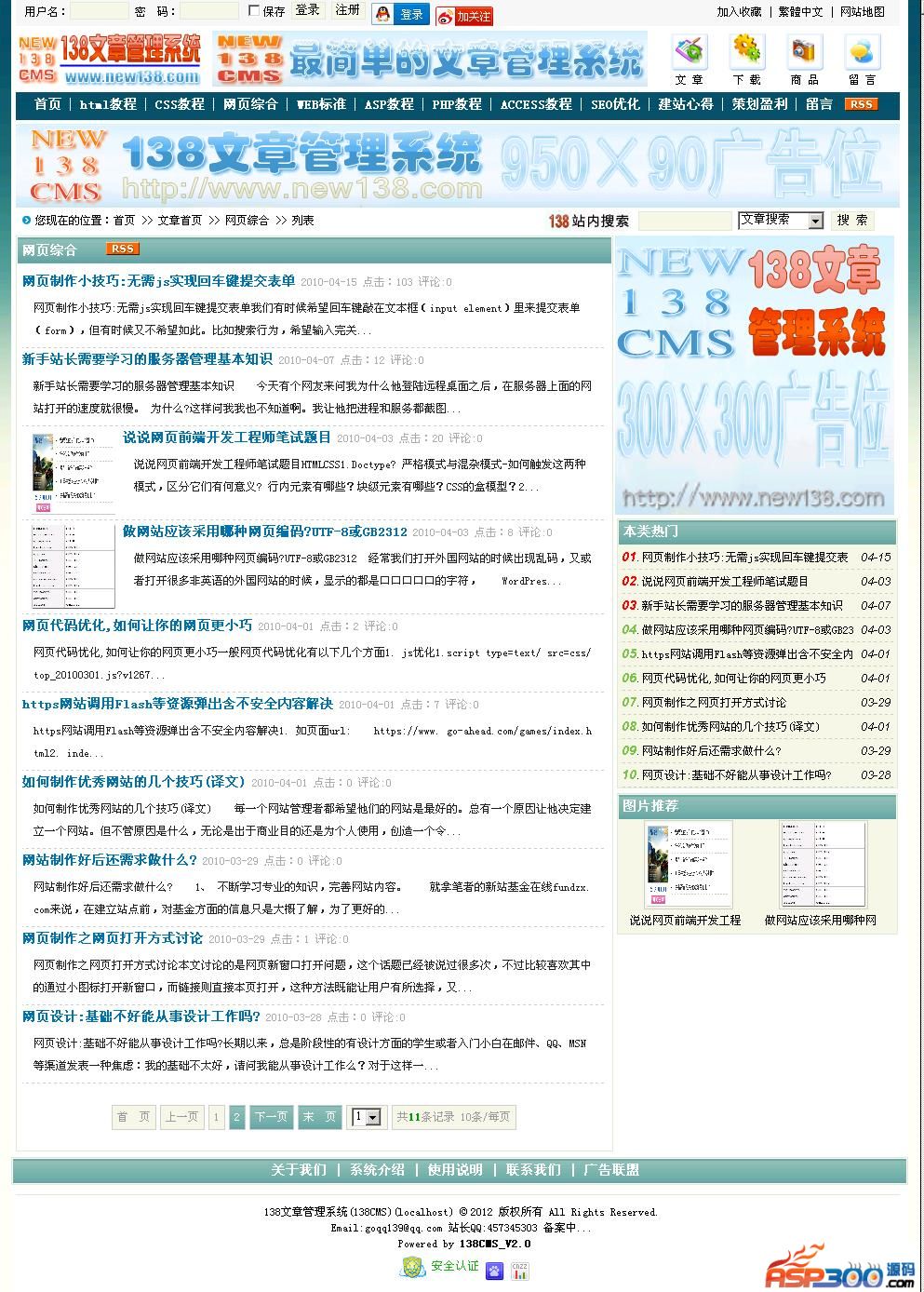138CMS网站管理系统采用Asp+Access开发,适应中小新闻文章类型或下载类型或图片类型网站及个人网站需求,整个网站采用Div+Css布局,IE6、IE7、IE8、Chrome、QQ、傲游、Opera、搜狗、百度、360、猎豹浏览器、等浏览器下测试无误,且兼容性良好!