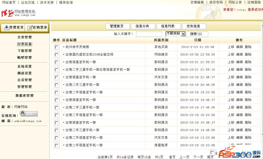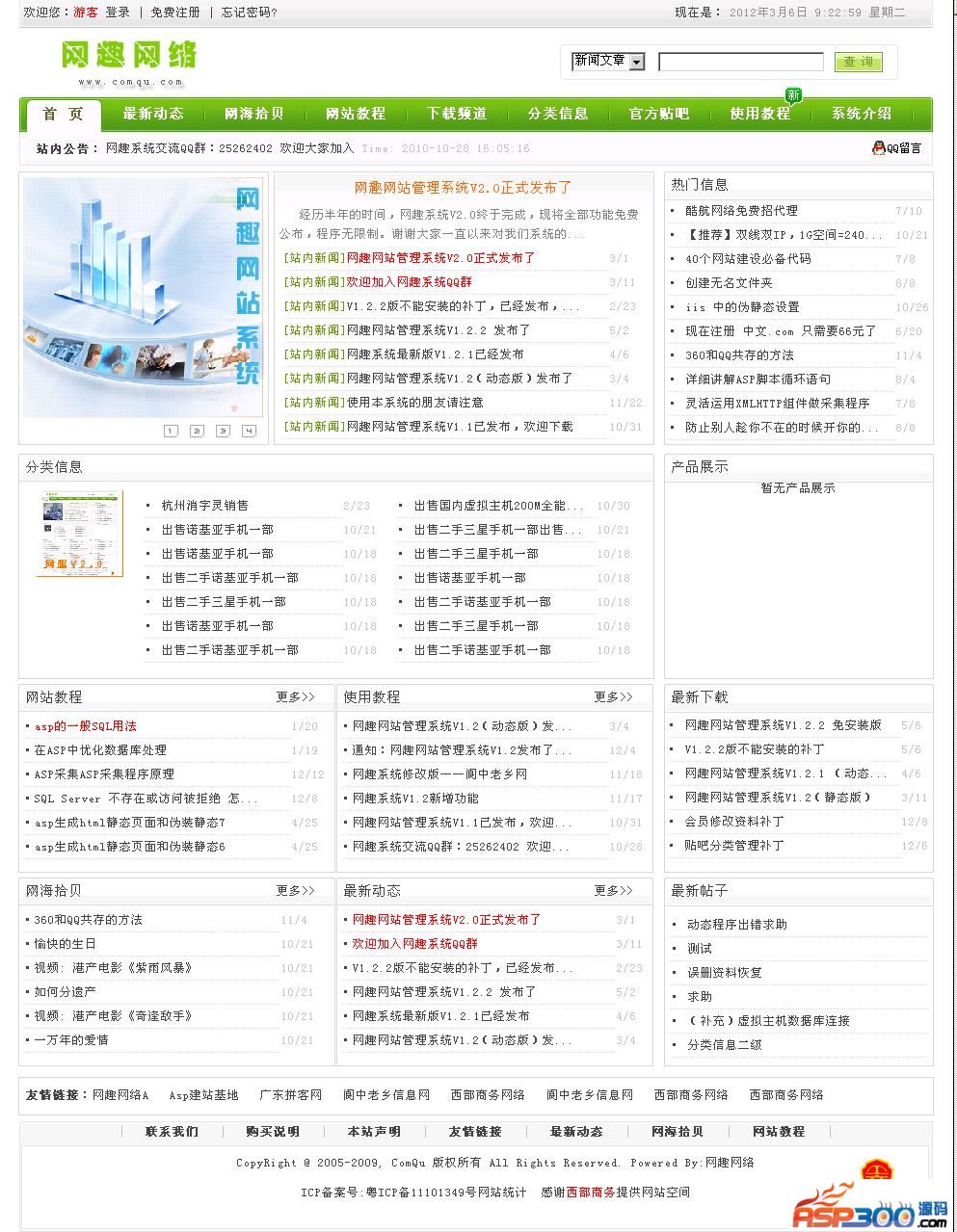 网趣网站管理系统V3.0功能:文章资讯、专题、下载、分类信息、贴吧以上所有功能免费开源,无加密、无限制。版本要求:服务器必须支持Jmail