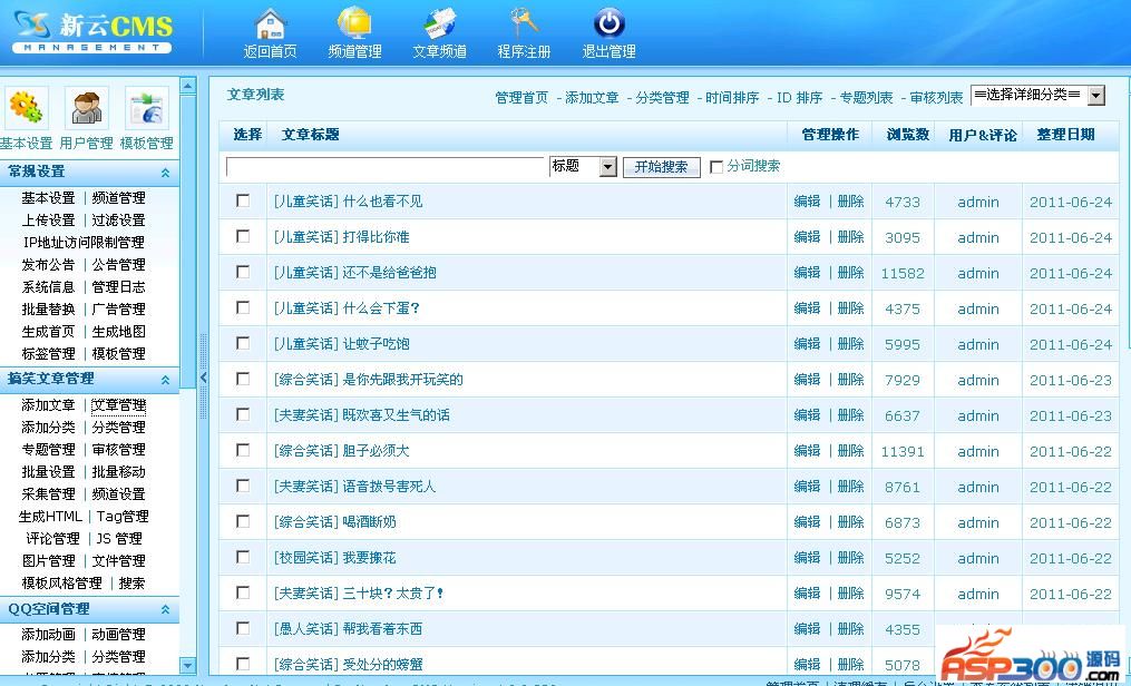 5.系统默认为ASP动态页面,如需生成静态HTML页面,请在后台 搞笑文章管理->频道设置 功能设置生成HTML选项,再生成所有对应的HTML页面即可