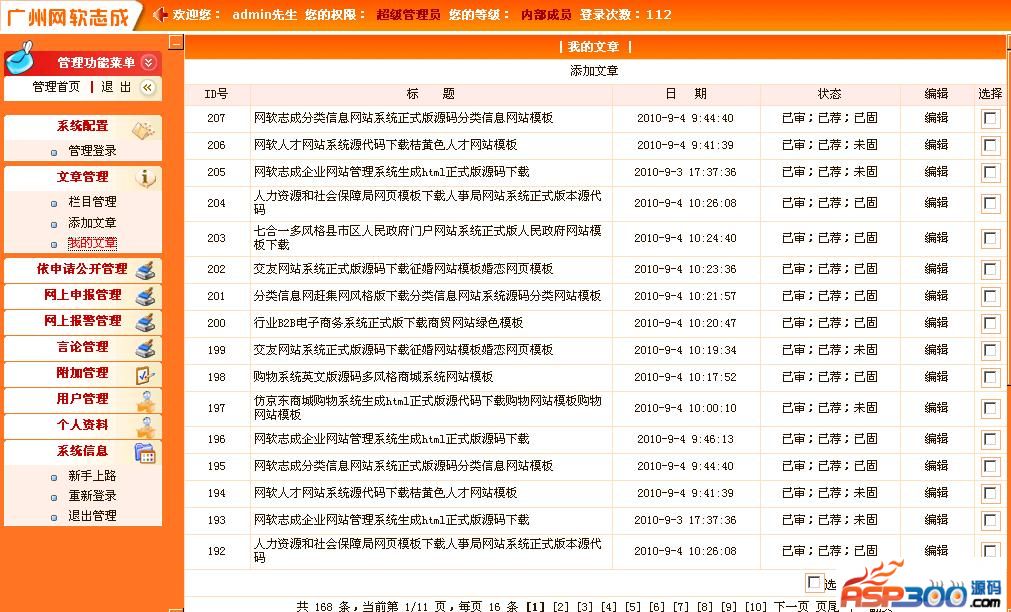 6、添加超管。 (用户分类:注册用户[普通][高级][特级]、可设置是否允许发布文章,是否需要审核。 小类管理员、大类管理员、总栏管理员、文章审核员、办事审批管理员、系统管理员,超级管理员,分别有不同有权限。)