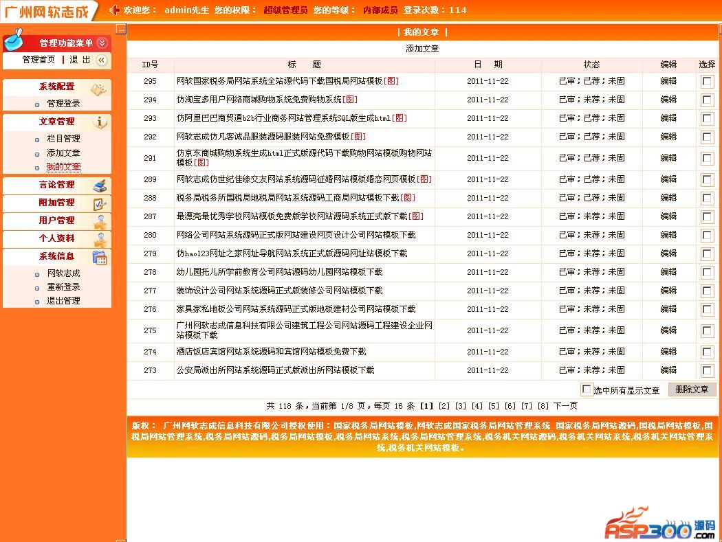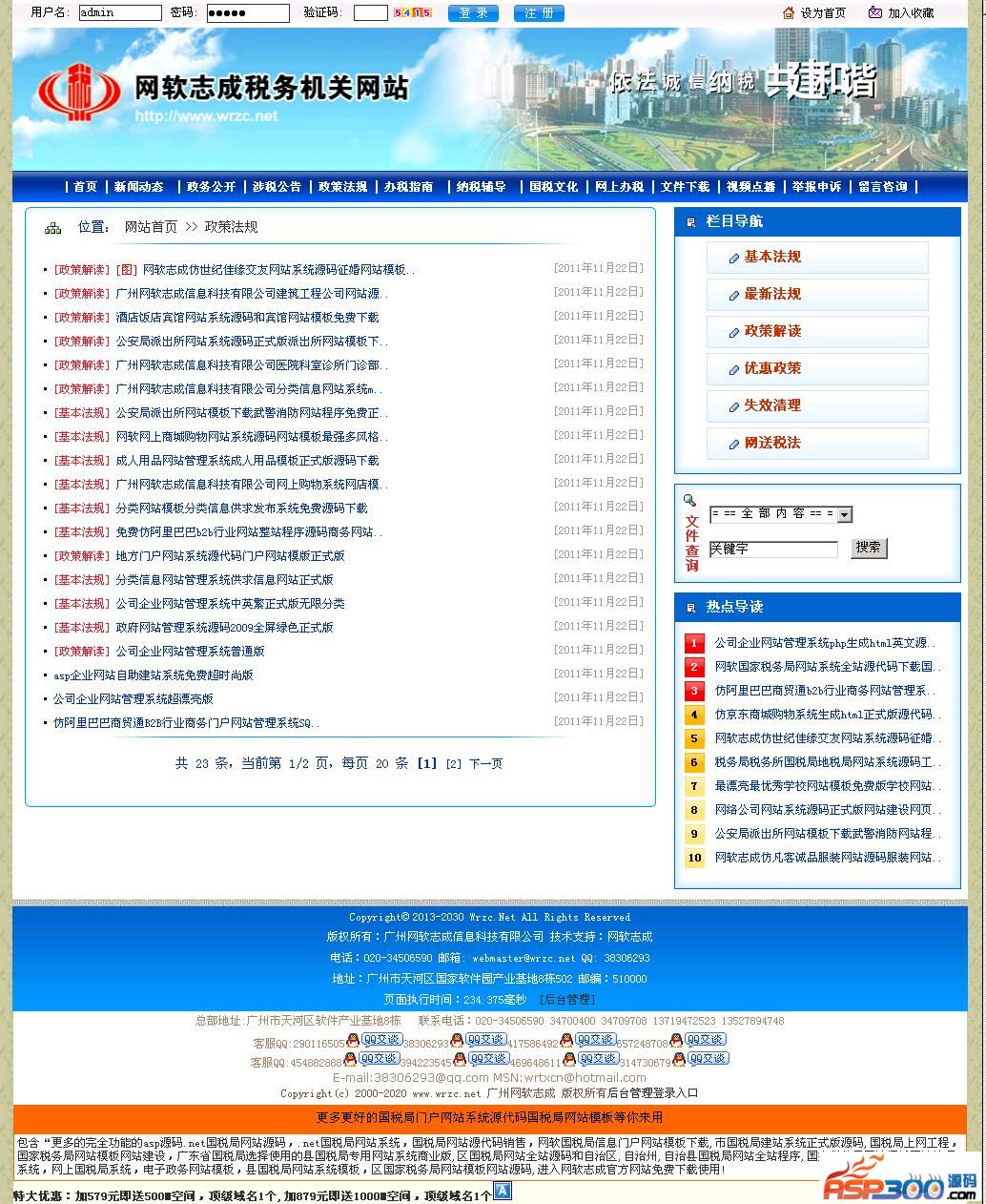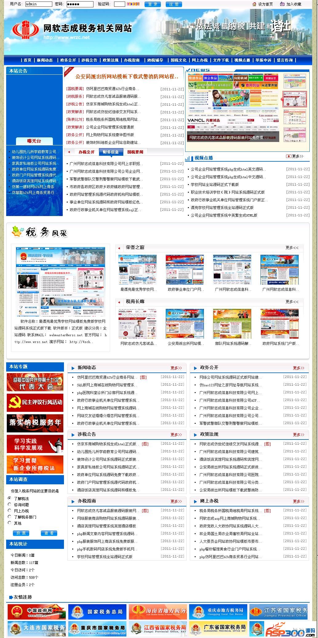 国家税务局,国家税务局网站,国家税务局网站模板,网软志成国家税务局网站管理系统 国家税务局网站源码,国家税务局网站系统,国税局信息网模板,国家税务局网站建设。后台管理从前台网站输入http://***.***.***/login.asp 进入后台管理,管理员:admin 登陆密码:admin