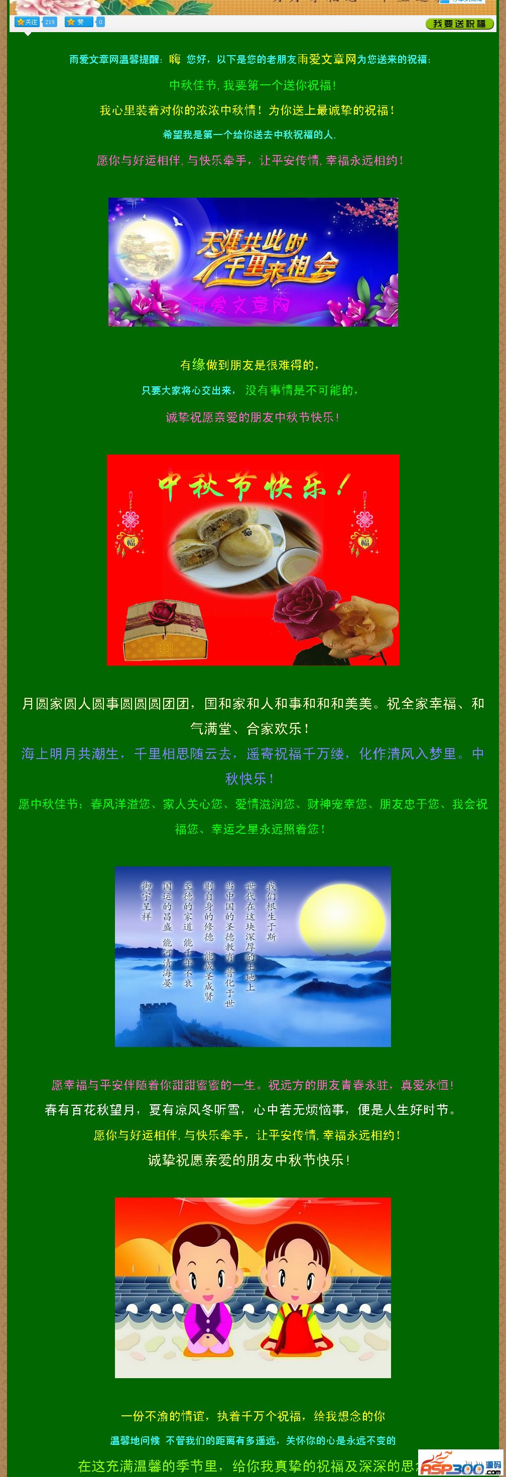 2012年龙年中秋节祝福网页源码,静态HTM格式,无需数据库支持,任何支持静态网页的空间都可以使用。支持浏览者自定义祝福页面,个性化强,站长宣传利器。 > > 下载地址 下载地址已转移到新版网站,请点击左上角-首页,在新版网站搜索此套源码的标题进行下载。