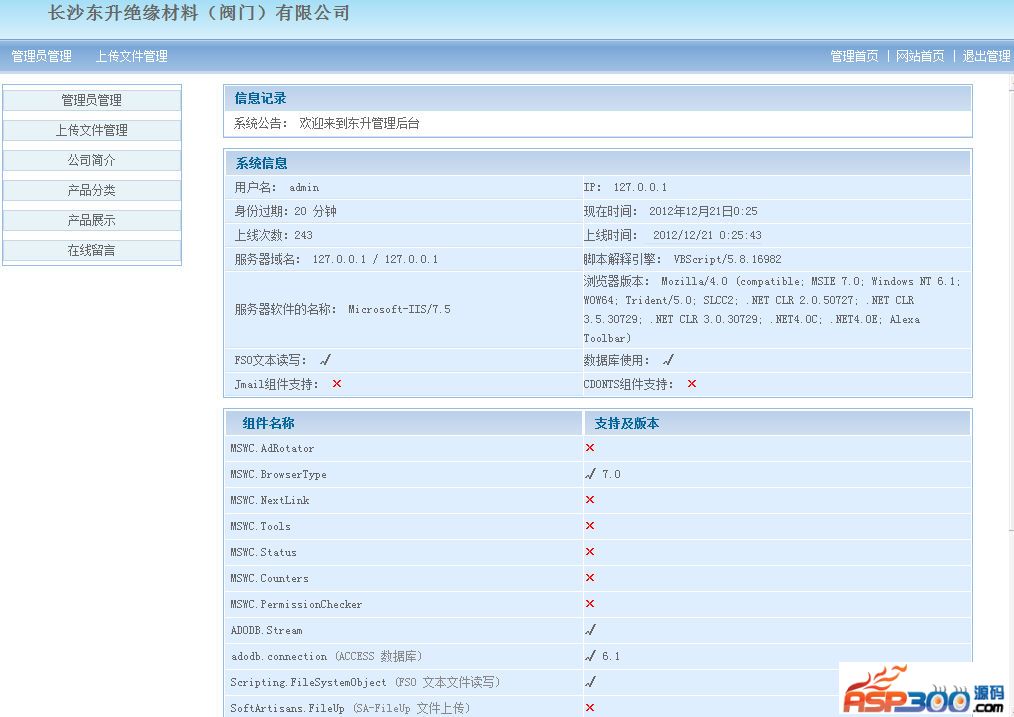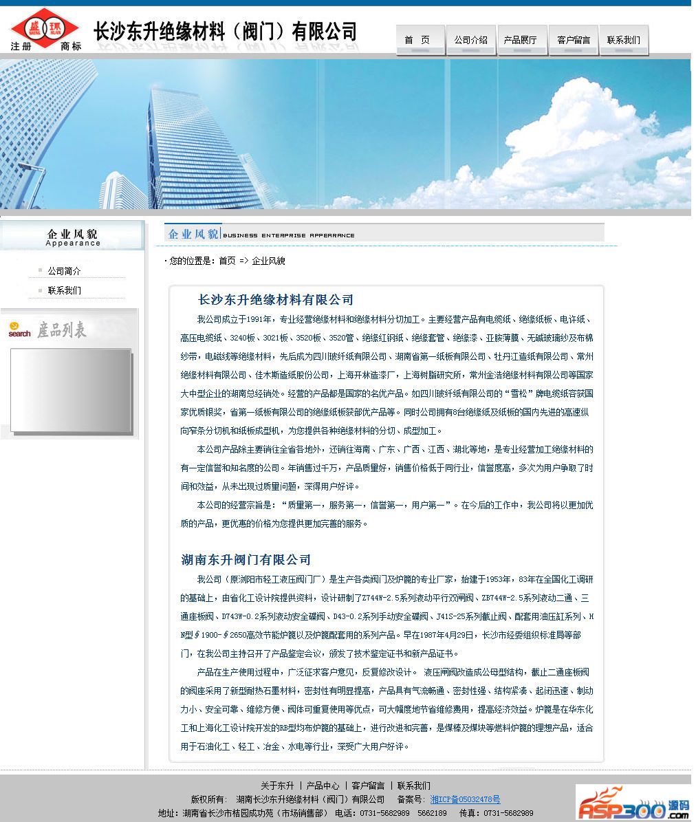 长沙东升绝缘材料有限公司网站源码,后台可在线,管理上传的文件,填写公司的简介,添加产品分类,添加产品信息,在线留言等.