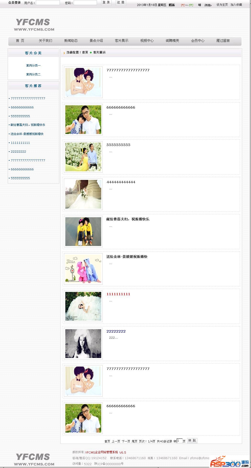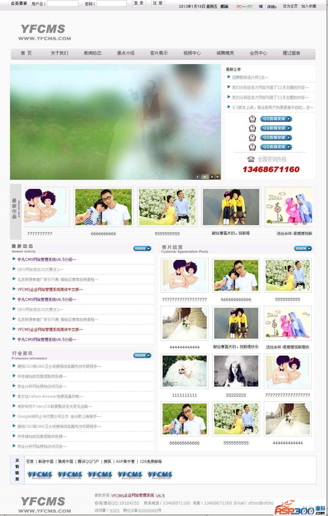 YFCMS企业网站管理系统纯白婚纱摄影版 网站后台:www.xxx.com/admin/login.asp 默认帐号:admin 密码:admin 下载地址 下载地址已转移到新版网站,请点击左上角-首页,在新版网站搜索此套源码的标题进行下载。