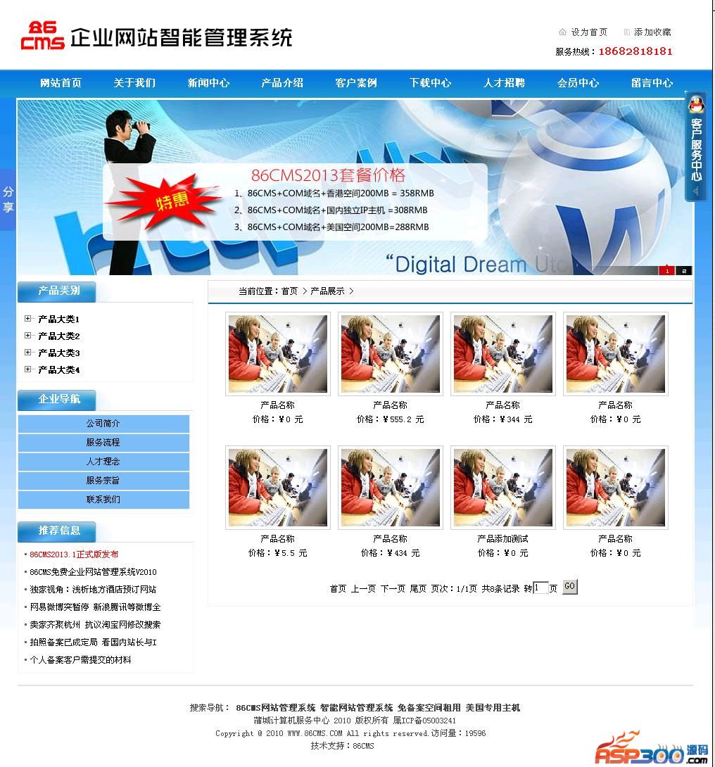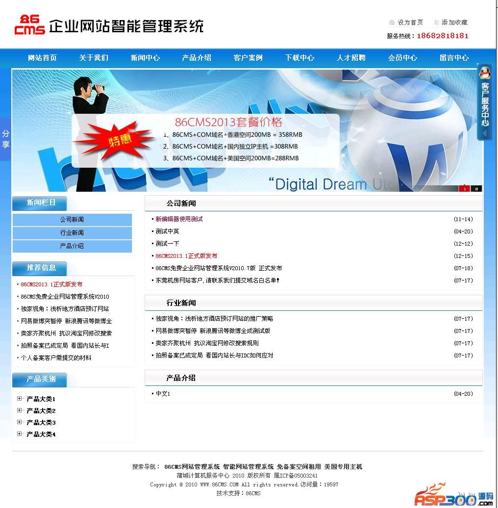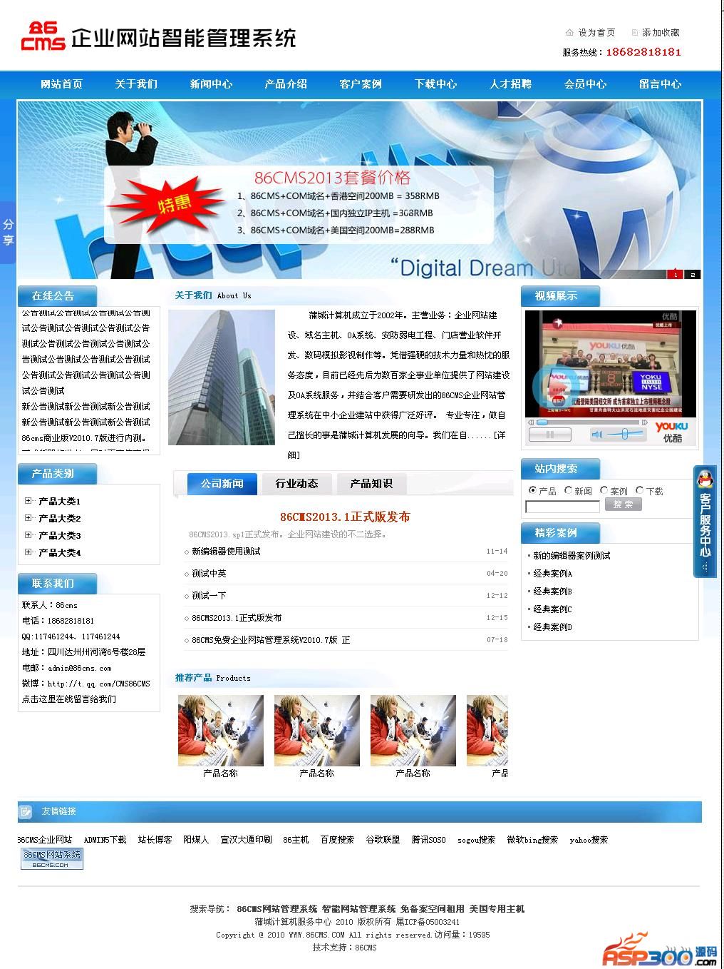 86CMS企业网站管理系统为智能ASP网站管理程序,适合中小企业自建网站、二次开发使用。本程序具有体积小巧、程序文件结构严谨、界面清爽简单、功能强大、非专业人士使用入门快、中小企业使用投资小等实用特点。