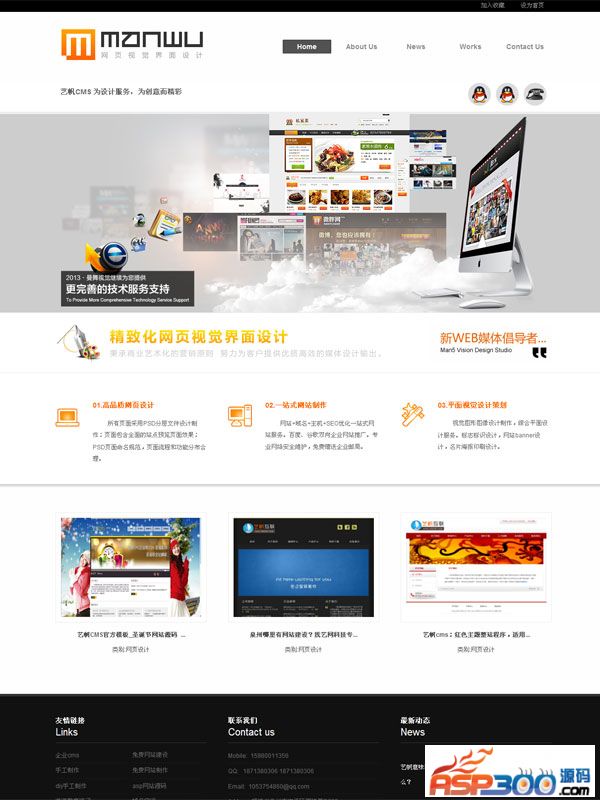 同时简约不简单的设计,让本网站源码很适合视觉设计行业使用,虽然目前的内容为网站建设内容,可是只要修改幻灯,上