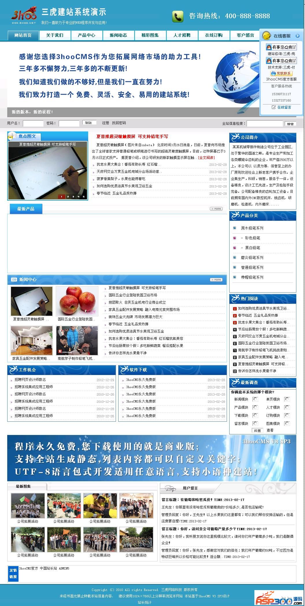 3hooCMS自V3版本以来,历时2年左右,历时SP1 和SP2两次再发行的改进,现数据结构合理、程序安全稳定、已经补全2年多时间收集的BUG和问题;能生成整站html静态和用伪静态实现全站静态化、细化到文章内容能自定搜索关键字的设置完全符合现今SEO需求,针对于部分用户抱怨的无详细手册以及默认模版不多的情况,官方也做了积极改进,已经随程序包安装了3套免费风格模版,更多的免费模版将在官网免费提供下载;在易用性方面更做了很多改进,包括重写整个后台UI,优化自定义表单系统等,3hooCMS是自由的,灵活的,我们最初的设计目的不仅仅是让您能拿3hooCMS做一个企业站,做一些学校的、行政机关的、行业的小门户都是3hooCMS完全能胜任的;