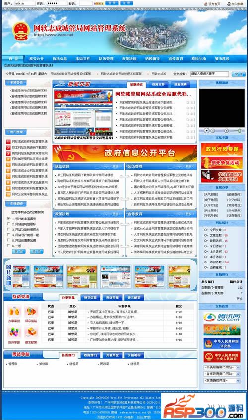 城管局,城管局网站,城管局网站模板,网软志成城管局网站管理系统 城管局网站源码,城管局网站系统,城市管理综合行政执法局信息网模板,城管局网站建设。后台管理从前台网站输入http://***.***.***/login.asp 进入后台管理,管理员:admin 登陆密码:admin