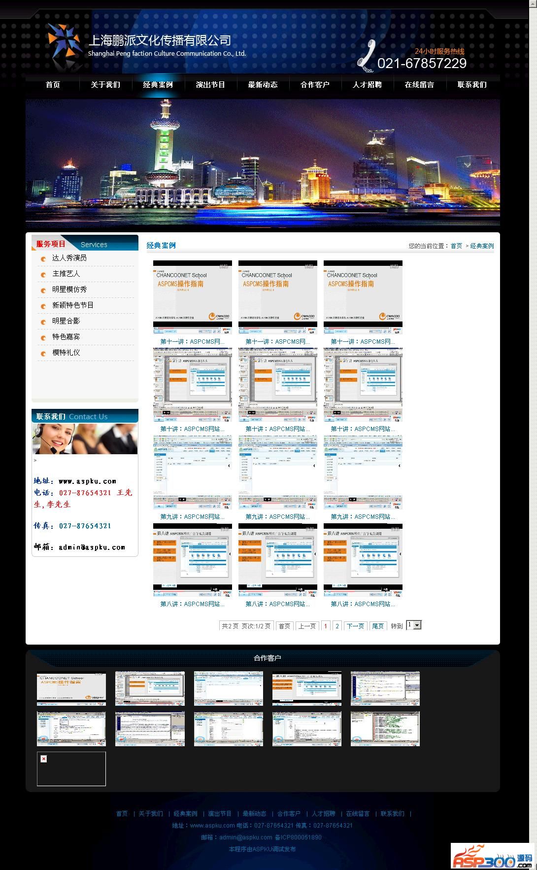 ASP文化传播公司网站源码是一款基于ASPCMS内核开发制作的企业类网站源码,网站界面采用黑蓝色设计!包含:经典案例、节目演出、合作客户、最新动态、在线留言等模块。首页Bananer广告位后台一键修改!