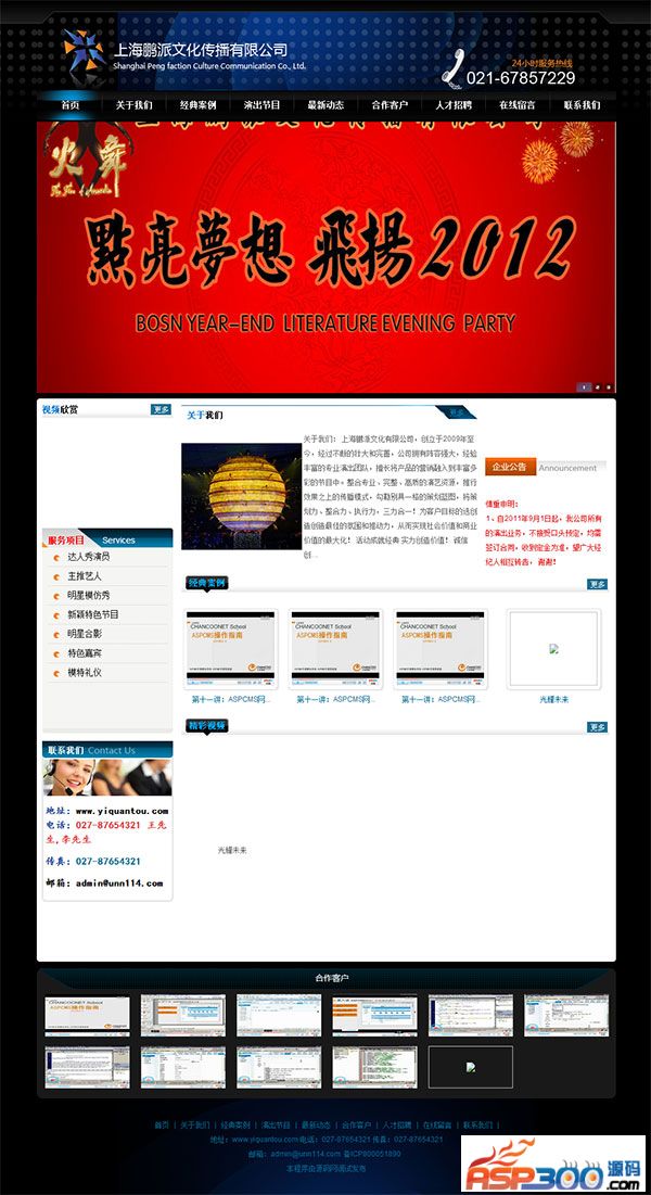 ASP文化传播公司网站源码是一款基于ASPCMS内核开发制作的企业类网站源码,网站界面采用黑蓝色设计!包含:经典案例、节目演出、合作客户、最新动态、在线留言等模块。首页Bananer广告位后台一键修改!