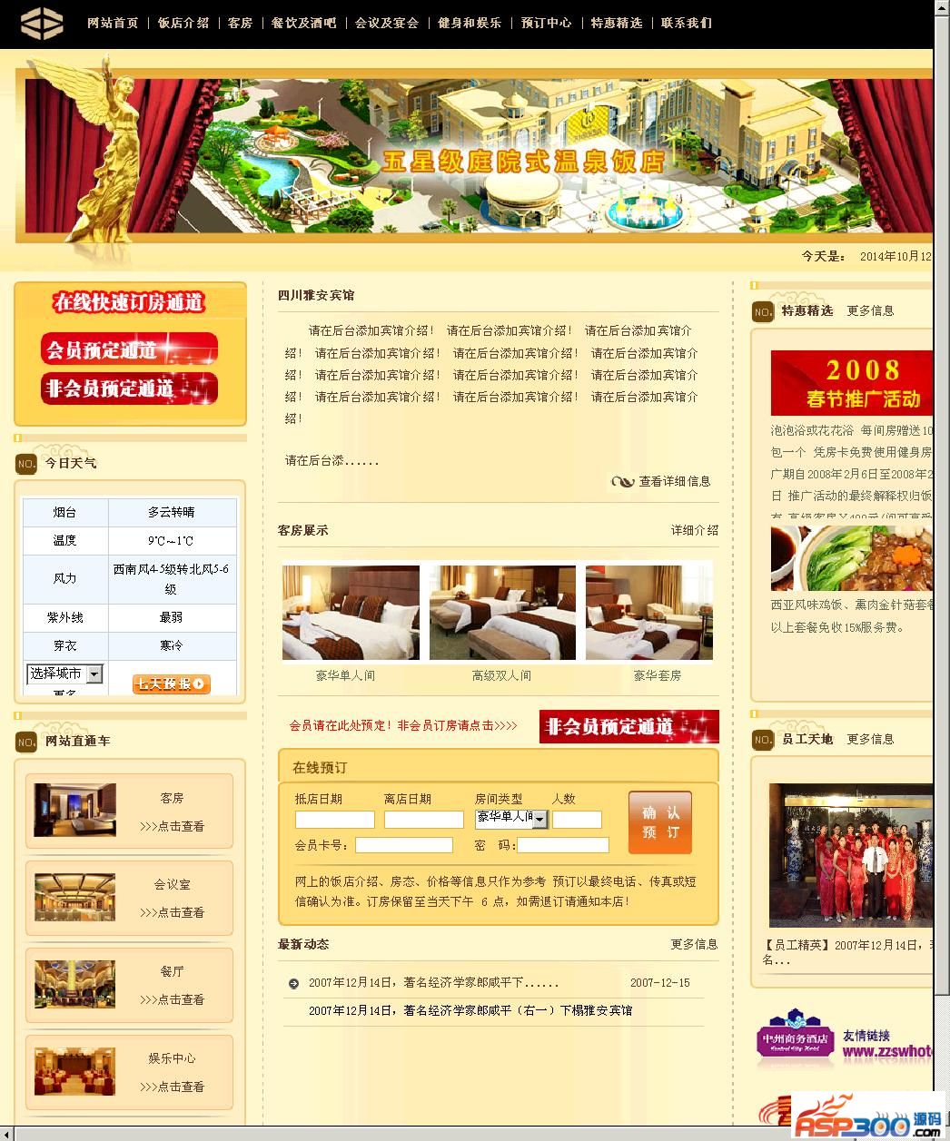 五星级宾馆网站整站源码,美工极品!包含在线订房、客房展示、宾馆介绍等各种功能。后台功能完整! 后台目录:admin/index.asp 登陆用户名及密码:admin 下载地址 下载地址已转移到新版网站,请点击左上角-首页,在新版网站搜索此套源码的标题进行下载。