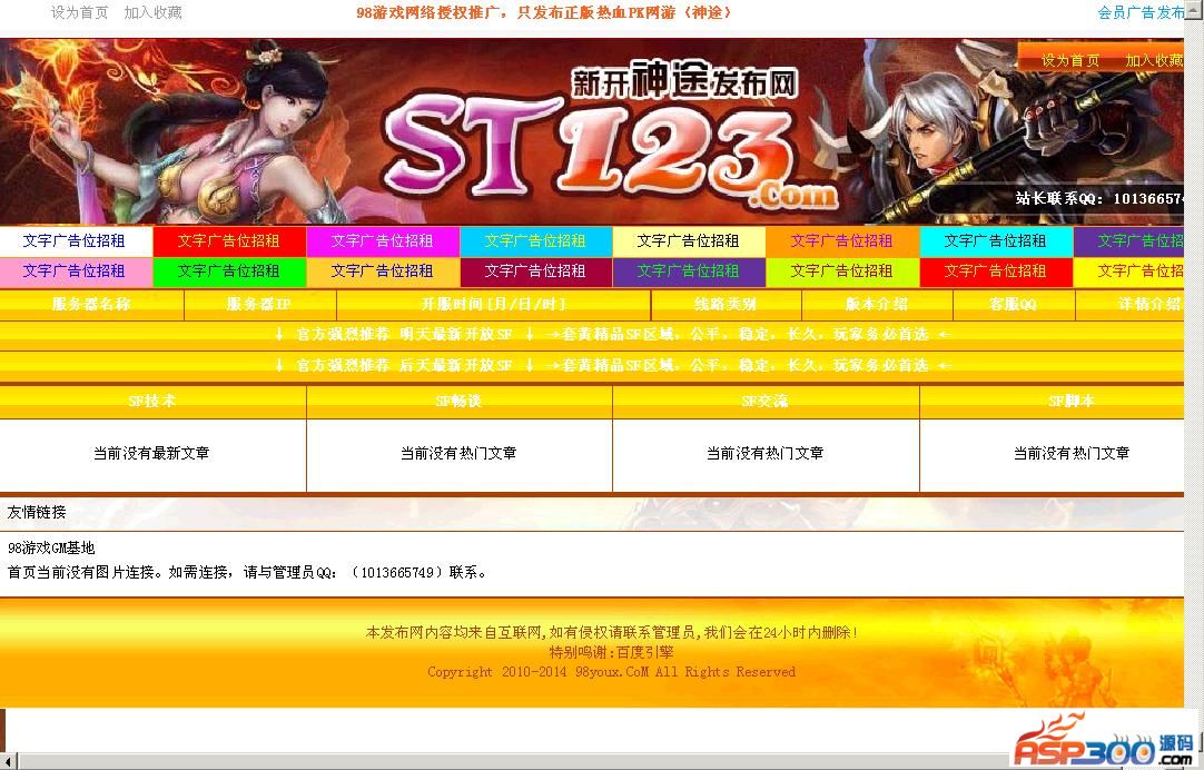 版本介绍1):游戏发布类型分全天套黄[24小时套黄],全天精品,套黄,通宵固顶,通宵推荐,连体广告!2):游戏分类支持各种游戏类型,具体操作,基本设置→游戏类型上有说明自由设置;不要问能不能做什么游戏,现在明确告诉你,发布站程序支持任何游戏的,只要你修改下文字和LOGO即可3):首页游戏显示天数支持今天,明天,后天,大后天几天时间,以及昨天,前天!4):套黄游戏跟随时间轮换显示,随机排序!(随机不影响多行重复连体广告的功能)5):通宵游戏在网站配置中自由设置时间段,只需选择通宵即可显示在套黄底部!6):只有通过审核但未套黄,未通宵,未精品的游戏将显示在免费游戏管理中!7):内带免费采集插件,支持传奇,天龙八部,奇迹,逐鹿,武易,传世,征途,完美,魔域,诛仙8):支持友情链接,与大站互换连接有助于你的发布站的发展哦!9):支持文章发布,文章没有点内容很难发展起来,每天多发几篇文章百度就常来了哦!10):支持战歌添加,支持下载管理,支持家族添加等11):支持图片广告,文字广告,代码样本也已经编写在内有助于你的修改!