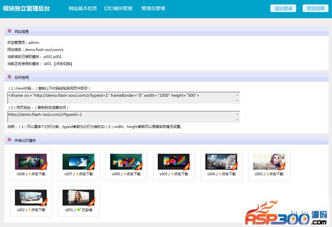 闪灵Flash相册模块V1.0布局简单功能强大,提供html代码、网页地址两种引用方法来调用模块,无论是将模块插入到网页中还是独立访问都可以完美实现!