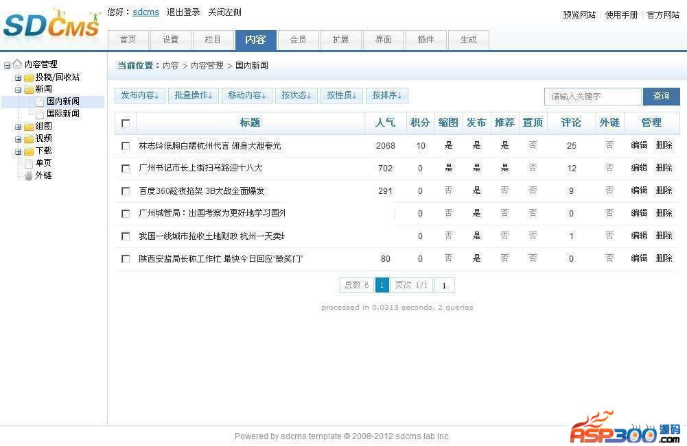 SDCMS门户版主要包含:文章、组图、视频、下载、单页、外链等模块,系统内置会员模型:会员组,VIP会员,积分购买,会员投稿,投票,评论,留言,心情,搜索,标签,头像组件,在线充值,支持QQ、新浪微博、支付宝等账户的一键登录登功能,是您快速建立类似A5,站长之家之类门户平台的良好选择。