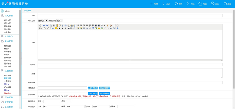22、seo功能,所有页面都支持后台自定义title,keywords,description,全局内链关键词,整站静态化,静态主路径自定义,外网文章批量采集,以及标题h标签优化,链接ul/li/a链接优化等seo功能。