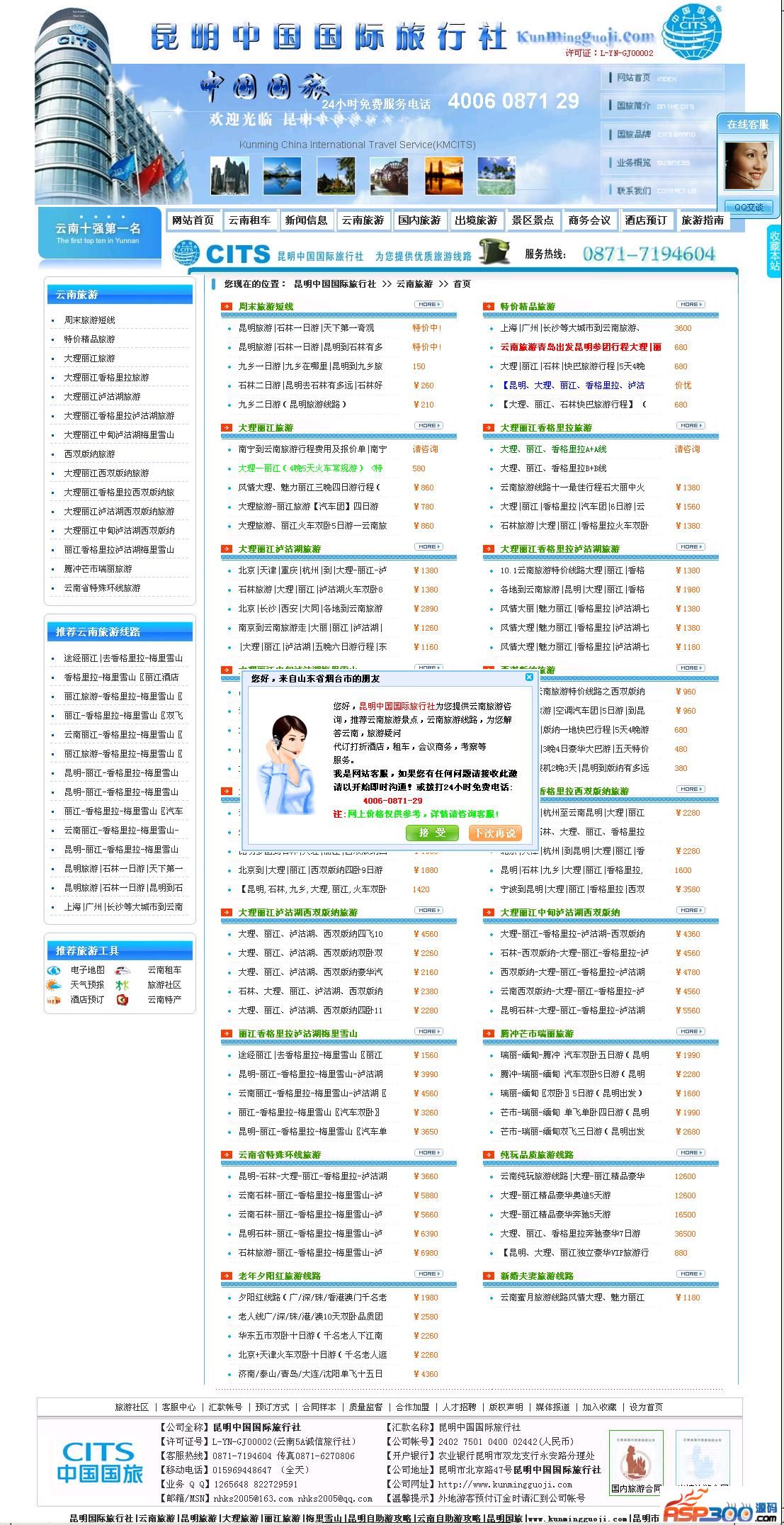 本源码为原昆明中国国际旅行社官方网站,织梦系统制作,简单大气。上传后正常安装织梦,再导入数据库生成即可。操作简单。全新的网站没有内容,没有版权。可在线采集,也可以安装织梦采集侠,只需加上您当地的旅游行程即可以做成一个当地大气的旅游网站了~有不明白的可以联系我本人安装哦~