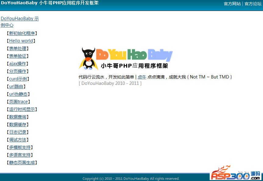 BUTIFUL APP START HERE | PHP-5.0-PHP-5.4以及更高版本支持官方网站:http://doyouhaobaby.net简介DoYouHaoBaby ( 全名:The DoYouHaoBaby PHP Framework )是一个极具美学价值的PHP开发框架,从代码、注释、文 档以及系统工具的用户界面均追求干净、整洁而高效。DoYouHaoBaby核心思想来自于QeePHP,使用习惯靠近ThinkPHP。关于代码更新最新代码大家可以从 https://github.com/dyhb/windsforce/tree/master/upload/source/include 找到最新的代码,相关更新也在那里。安装将 DoYouHaoBaby-2.5 压缩包解压至一个空文件夹。