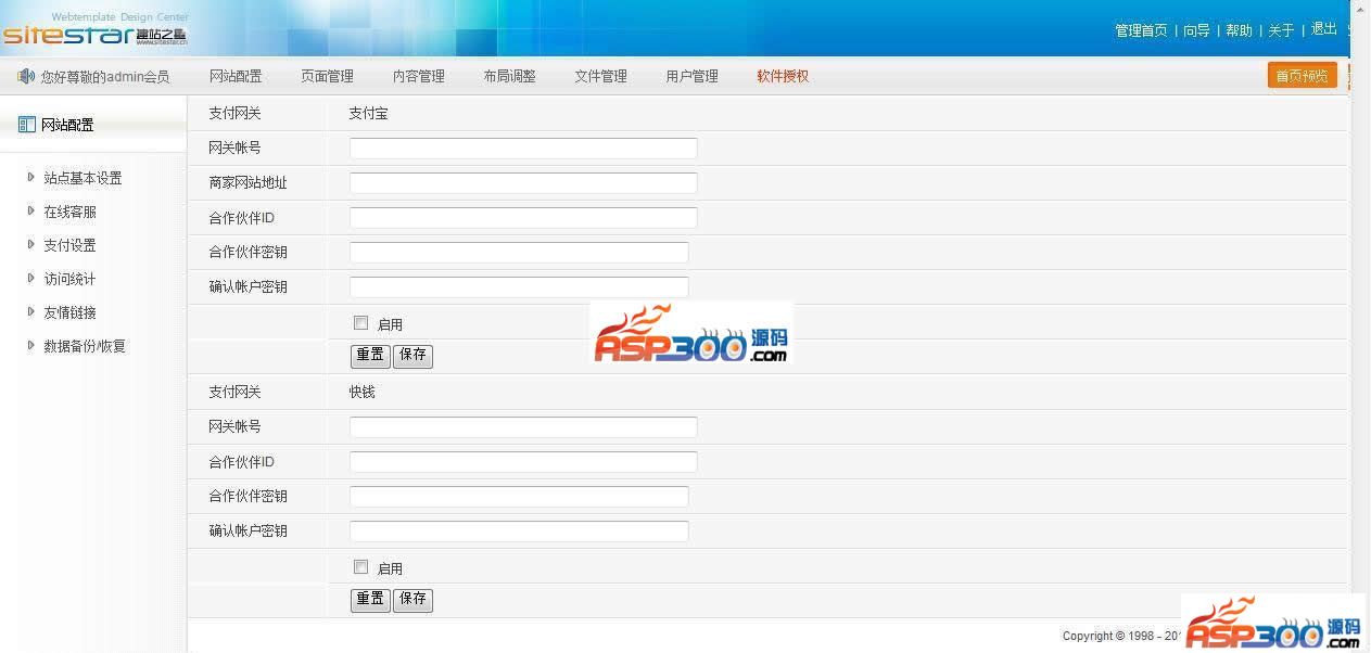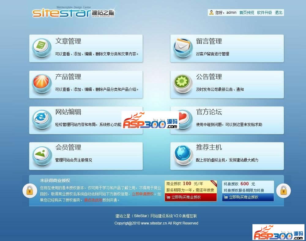SiteStar V2.7版功能说明:增加和改善功能1、站点基本设置中增加地址栏图标上传。2、调整文章、产品按后台顺序值从大到小进行排序显示。3、新增留言模块自定义留言项功能,方便各种网站留言表单需求。4、下载模块中,下载类型新增外部链接方式。5、友情链接、在线客服模块,新增排序字段,可调整显示顺序。6、新增走马灯按后台顺序值从大到小进行排序显示。7、增强公告模块设置滚动速度。8、产品列表显示方式,新增始终打开方式。9、新增批量移动文章或产品到指定分类功能。10、新增文件管理编辑器附件支持doc,docx,xls,xlsx,ppt,pptx,wps,pdf文件格式上传 11、添加页面,页面属性选择下载列表时,新增下载列表支持子类分类选择12、新增会员购物积分功能,需开启。13、访问模式新增自定义链接方式,这样页面地址可以自定义修改,有利于SEO优化。14、新增在线客服浮动窗口为固定展开显示。