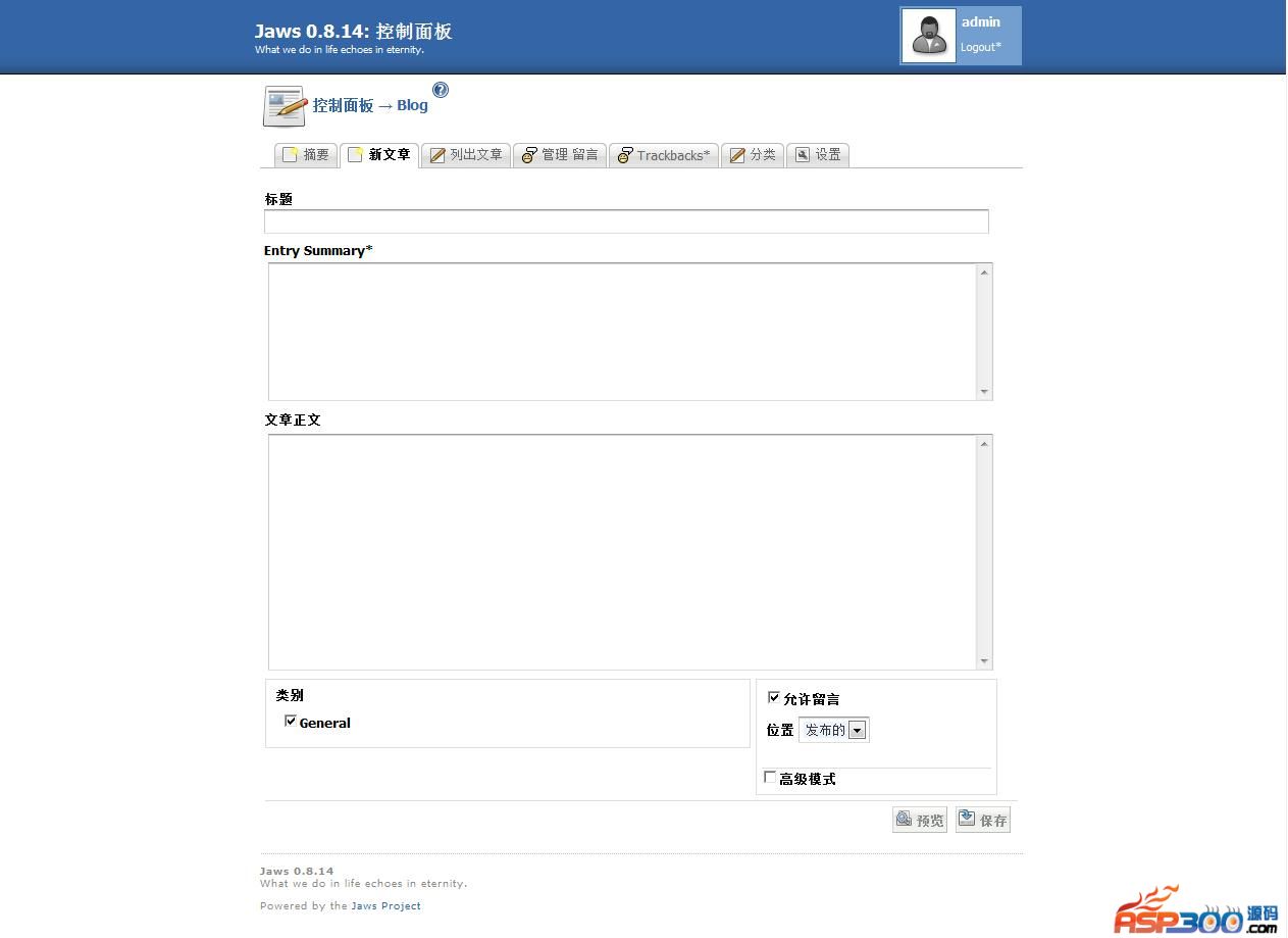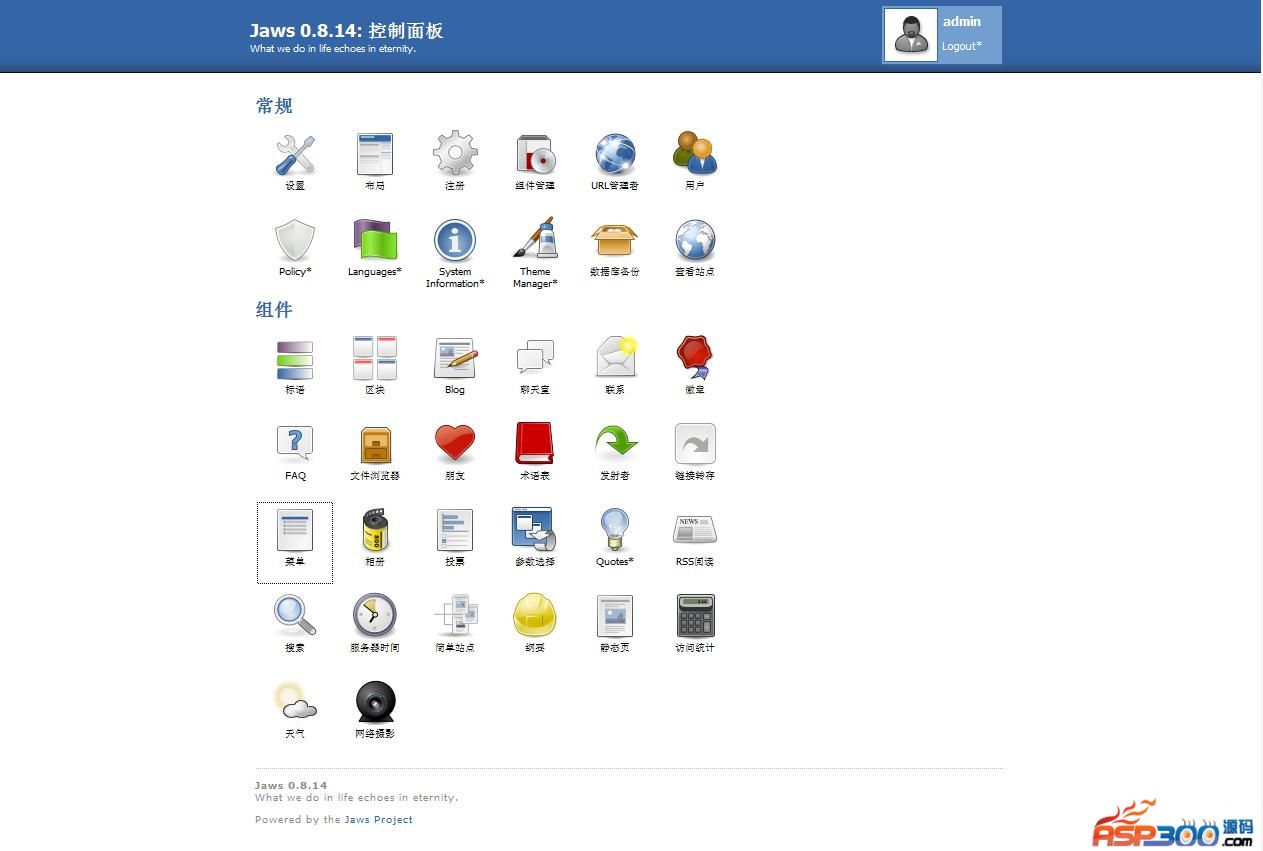 Jaws 是一个框架和内容管理系统的动态网站的建设。它的目的是要友好的用户提供易用和多种方法来定制的网站,但同时是开发者友好的,它提供了一个简单的和强大的框架。Jaws完整版包括爪的核心,所有小工具,所有的主题。 下载地址 下载地址已转移到新版网站,请点击左上角-首页,在新版网站搜索此套源码的标题进行下载。