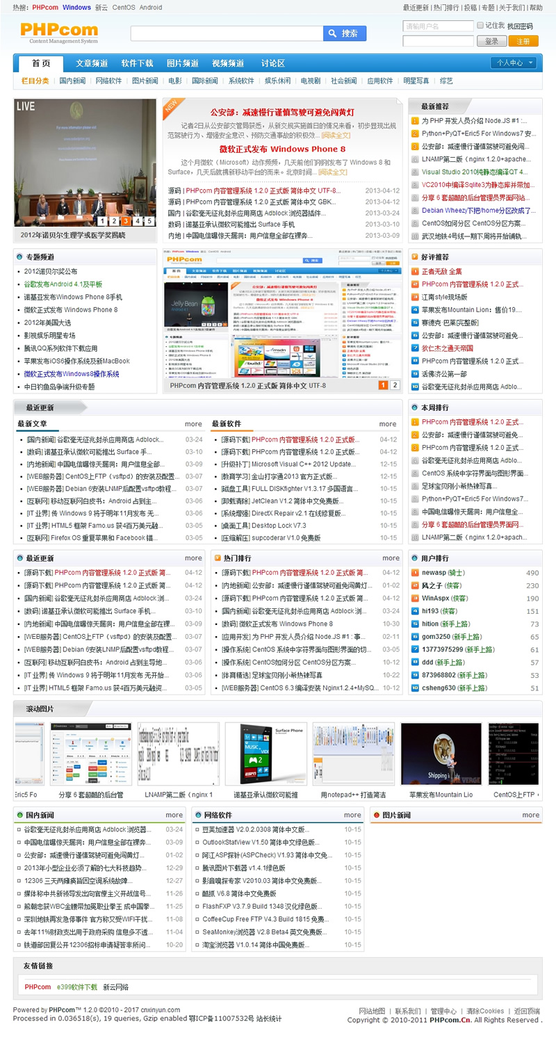 PHPcom是一套基于PHP和MySQL数据库构建的开源且易于使用的内容管理系统!应用于各种服务器平台的高效、快速和易于管理的网站解决方案,包括文章、下载、图片、视频和用户管理等多种功能模块构架,适用于企业、门户、学校等不同群体及个人的建站需求!