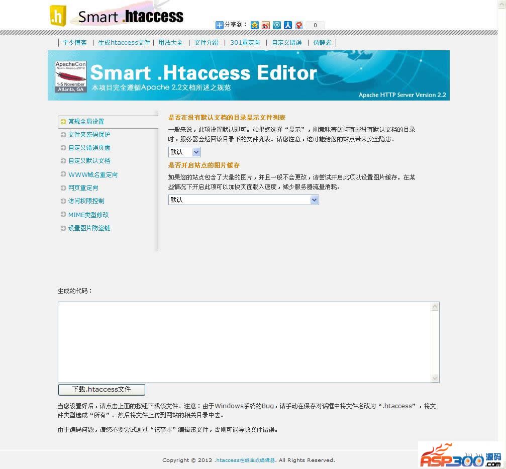 .htaccess在线生成编辑器 是一个免费的在线生成工具,它能够为你的网站快速生成一个 .htaccess 文件。使用非常简单,在页面左侧选择类别,再按照提示在右侧输入相关信息。最后把生成的代码以“.htaccess”的文件名保存在网站根目录下即可。