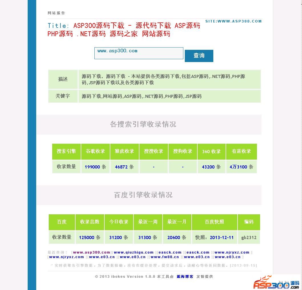 网站SEO报告系统可以实时查询百度(今日、一周、一个月、百度快照)、谷歌、雅虎、搜搜、搜狗、360、有道的收录及网站编码。