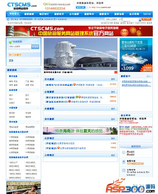 CTSCMS V8.0是一款专业旅游服务网站管理系统,程序采用PHP+MYSQL开发,功能模块包括:旅游线路、酒店预定、旅游租车、公司旅游、旅游签证、旅游资讯、旅游攻略、经典介绍、问答、会员系统及抵用券管理,网站系统支持生成静态HTML,该程序非常适合旅行社或地方旅游建站使用。