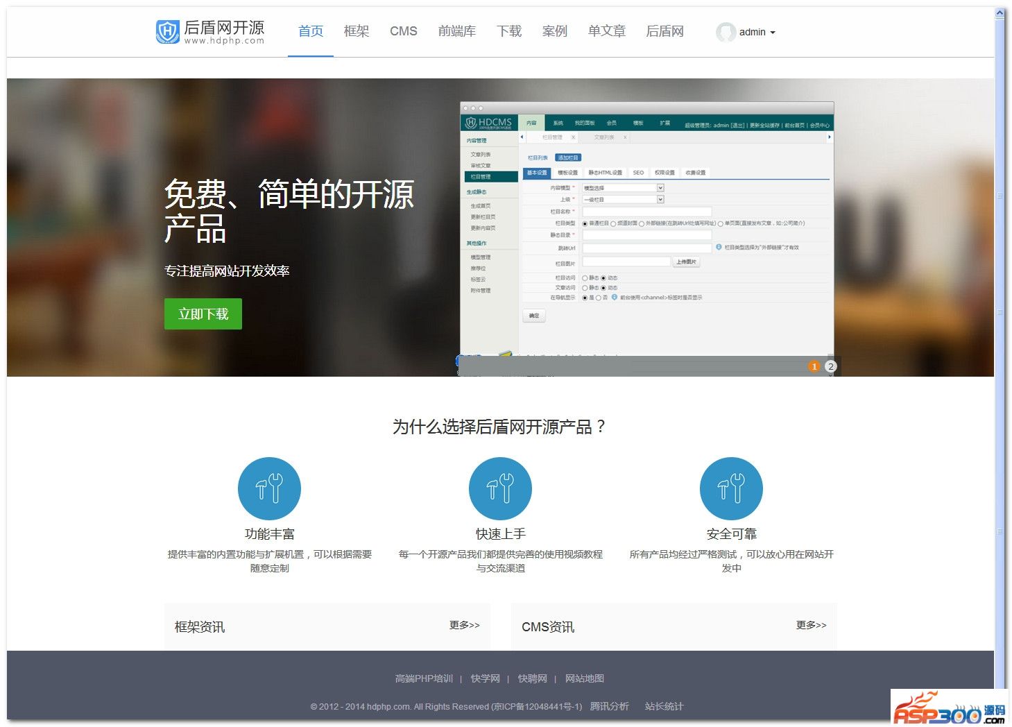 一个用PHP编写的内容管理系统软件包,数据库采用Mysql。提供强大的、完整的功能,满足快速网站开发的目的。你不需要很长时间就可以开发出一个很不错的网站,而且后盾网提供很多优秀模板,让你连做模板的时间也省掉,而且我们会定期举行免费远程培训,让你的学习与使用变得更轻松。环境要求PHP版本需要5.1+以上才可以。100免费HDCMS是完全免费的,你不用担心任何版权问题你可以用在任意网站(包括商业网站)你不需要支付任何费用HDCMS完全基于后盾网HDPHP框架开发提供了众多的安全特性,产品安全无忧。这些特性包括:COOKIE加密处理数据预处理机制XSS安全防护表单自动验证强制数据类型转换输入数据过滤表单令牌验证防SQL注入图像上传检测优秀特性支持提供多项优化策略,速度非常快采用 MVC 设计模式生成干净的 URL灵活简单的html标签数据调用内容页tag管理全站搜索关键词管理全站HTML静态化安全的数据备份自定义模型管理支持Memcached与NoSql灵活简单的标签特性每周更新一个新功能